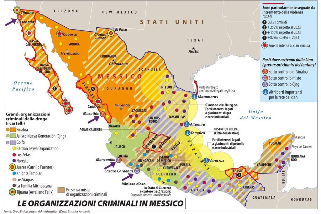 Come sempre le parti sono tre. Ordinarie follie ospita contributi diversi su temi legati alla cosiddetta rivoluzione americana che, con una raffica di ordini esecutivi, Trump sta mettendo in atto: intelligenza artificiale, nascita di Stargate e rapporti tra tecnomiliardari, guerra deterrenza e transizione egemonica (Se la Bomba non ci protegge più dalla Bomba, di Agnese Rossi, e La guerra è noi di Giacomo Mariotto), questioni di genere (Il genere come disordine. Sull’identità non binaria, di Nicola Cirulli), capitalismo finanziario, impero del caos come crisi del neoliberismo (La governanza è il caos, di Giuliana Commisso, approfondimento prezioso anche per lezioni di economia politica), migrazioni e cartelli criminali. Su questi ultimi si segnala l’interessante approfondimento di Laura Canali, Il Messico dei cartelli.