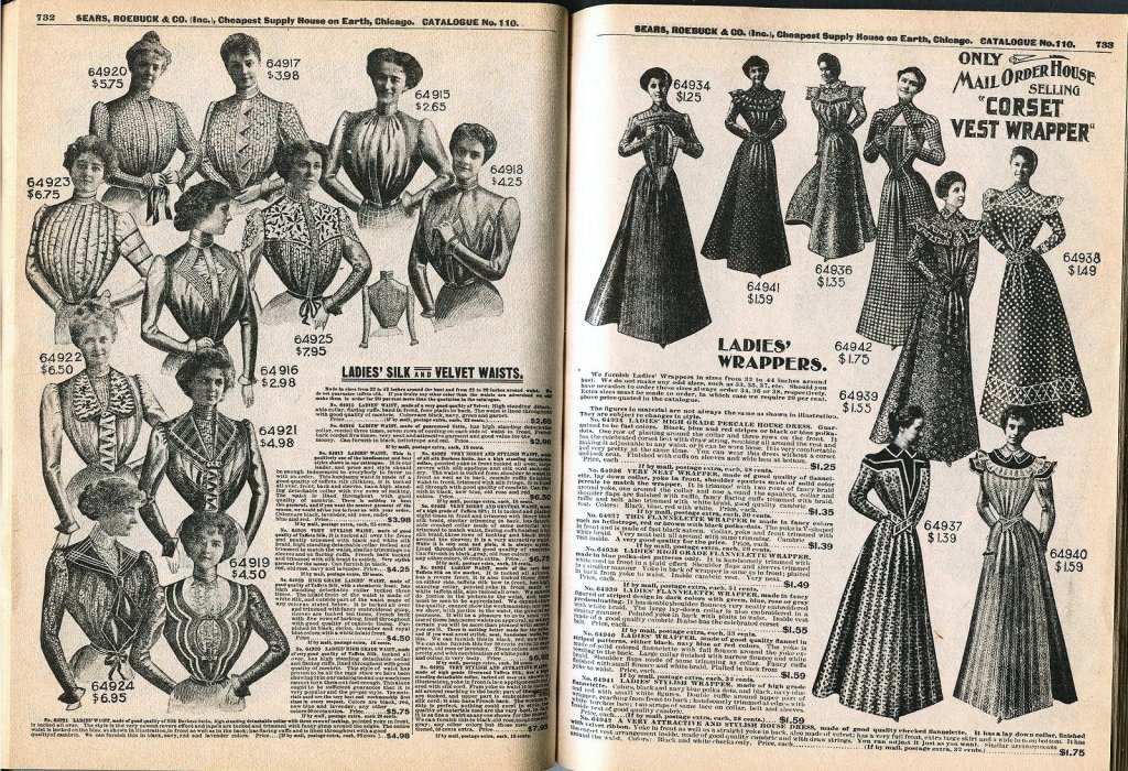 Tornando all’argomento principale ovvero femminismo e uniformi, devo sottolineare che una volta che ci fu il “matrimonio” tra produzione industriale di massa e capi pronti per l’uso, gli Stati Uniti divennero la patria dei vestiti ordinati da catalogo, dato che difficilmente nel West si trovavano sarte a disposizione e, come si è detto, la Singer non era poi proprio economica. Lo spirito imprenditoriale americano, infatti, non vedeva perché non fosse possibile creare vestiti borghesi e tute da lavoro su taglie uniformate, visto che il criterio era già in uso per l’esercito. La diffusione dei cataloghi per corrispondenza, come quelli di Sears, Roebuck & Co., permetteva inoltre a chi abitava delle aree rurali di accedere alla moda senza doversi recare fisicamente nei negozi, un fatto che era molto importante vista la vastità del continente americano. In breve sorsero fabbriche di abbigliamento confezionato che potevano soddisfare ogni genere di clientela. Il problema era tuttavia di far fare al vestito confezionato un salto di classe, ovvero farlo passare da abito per le classi meno abbienti urbane e rurali a indumento per la buona borghesia.