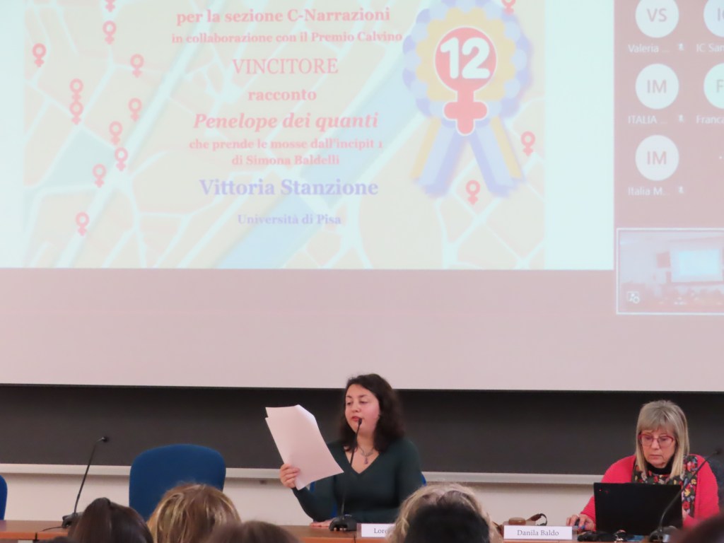 Intrigante già il titolo, Penelope dei quanti, il racconto è stato scritto da Vittoria Stanzione, dottoranda in fisica all’Università di Pisa. Su di esso la giuria ha espresso il seguente giudizio: «In una originalissima versione del mito la protagonista si trova, in quanto donna, nella condizione di “un elettrone sospeso in uno stato indefinito, in attesa che una misura la definisse”, temendo che “il mondo attorno a lei l’avrebbe costretta, comunque, su di un’unica traiettoria”. È la sua arte, il suo arazzo a salvarla svelandone le infinite possibilità. Molto apprezzati sia l’inedita idea di fondo sia lo stile del racconto».