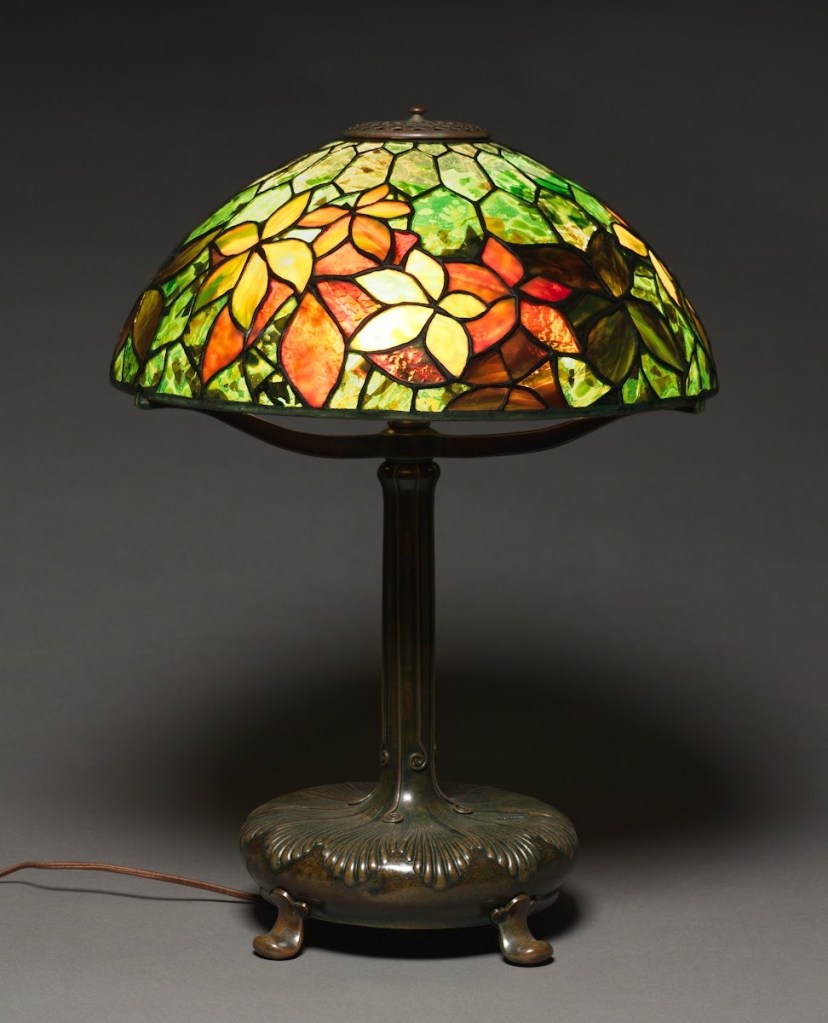 Meravigliosa Wisteria, con il gioco delle sfumature di azzurro e giallo, tanto da formare una gioiosa cascata di luce, di cui furono fatti 123 esemplari, tutti rigorosamente a mano, utilizzando circa 2000 (avete letto bene) pezzetti di vetro per ciascuno; nel 1906 costava 400 dollari. Questo non era artigianato, pur di classe, questa si chiama arte.