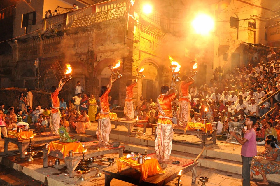 Gli uomini e le donne eseguono le lente operazioni di purificazione: c’è chi lava i panni nel Gange, chi si taglia barba e capelli, chi si immerge purificando anima e corpo nelle acque del fiume, c’è chi fuma, chi aggiusta la propria imbarcazione e chi medita, c’è chi aspetta la cerimonia di cremazione del proprio caro defunto e chi aspetta di morire a Varanasi — sì, perché si viene a Varanasi quando la morte si avvicina e la si attende. Il ghat principale è il Manikarnika, uno dei luoghi di cremazione più antichi e sacri di tutto l’induismo; i fedeli credono che morire qui porti alla liberazione, la mokṣa, dal ciclo delle reincarnazioni, il saṃsāra. Il cadavere viene deposto sulla pira con i piedi verso il Gange e la testa orientata verso il tempio di Shiva, con il viso rivolto verso l’alto per facilitare l’ascesa della sua anima al cielo. Per bruciare un corpo occorrono circa 2 ore e mezzo. Noi abbiamo assistito alle cremazioni che non possono essere fotografate. A esse si dedicano soltanto uomini, anche se la salma è di una donna; l’odore è forte e lo spettacolo è da brividi.