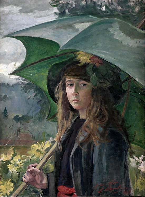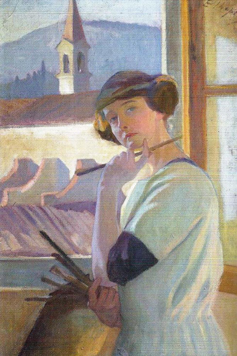 Non aveva ancora vent’anni, nel 1908, quando realizzò un autoritratto sotto la cupola di un ombrello verde, in cui le influenze impressioniste, la pennellata rapida e il senso di compenetrazione con la natura circostante costituiscono i tratti distintivi del dipinto. Lo sguardo serio e intenso della ragazza restituisce l’idea di un’artista già consapevole nonostante la giovane età, quasi prefigurasse una collocazione prestigiosa dell’opera.