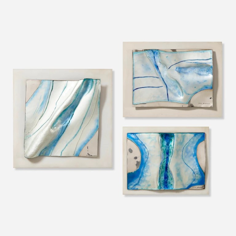 Nel corso della sua carriera Inger Hanmann incontrò Marius Schou, direttore della C. Schous Fabrikker, che le consigliò di utilizzare lo smalto industriale per il suo lavoro artistico. Questo cambiamento portò a una nuova fase creativa, in cui Inger realizzò molte opere di argenteria smaltate, alcune intarsiate con foglie d’argento e d’oro. Gli effetti di luce e colore emanati dallo smalto esercitarono una notevole influenza sui suoi dipinti. Schou, infatti, la incoraggiò a sperimentare un utilizzo artistico della tecnica di smaltatura industriale che faceva parte della produzione dell’azienda. Inger iniziò così il lavoro su un ampio e sfaccettato numero di opere decorative innovative, alcune delle quali di grande formato. I suoi esperimenti attirarono l’attenzione di altri artisti e portarono a proficue collaborazioni con gli argentieri di A. Michelsen e Georg Jensen: qui trasferì la sua esperienza pittorica in una serie di opere originali smaltate. Le ciotole e i rilievi, lisci e in seguito anche ripiegati, sono tutti pezzi unici, decorati con smalto per gioielli e talvolta anche con fili intarsiati, foglia d’oro e argento fino. Queste opere prendono il nome di holloware, vale a dire ciotoline smaltate appunto. Le tecniche dello smalto hanno avuto un effetto sulla pittura di Inger Hanmann, che gradualmente si è quasi completamente liberata della base figurativa e ha acquisito forza e tranquillità attraverso una sempre maggiore semplificazione e immersione nella luce, nel colore e nella composizione.