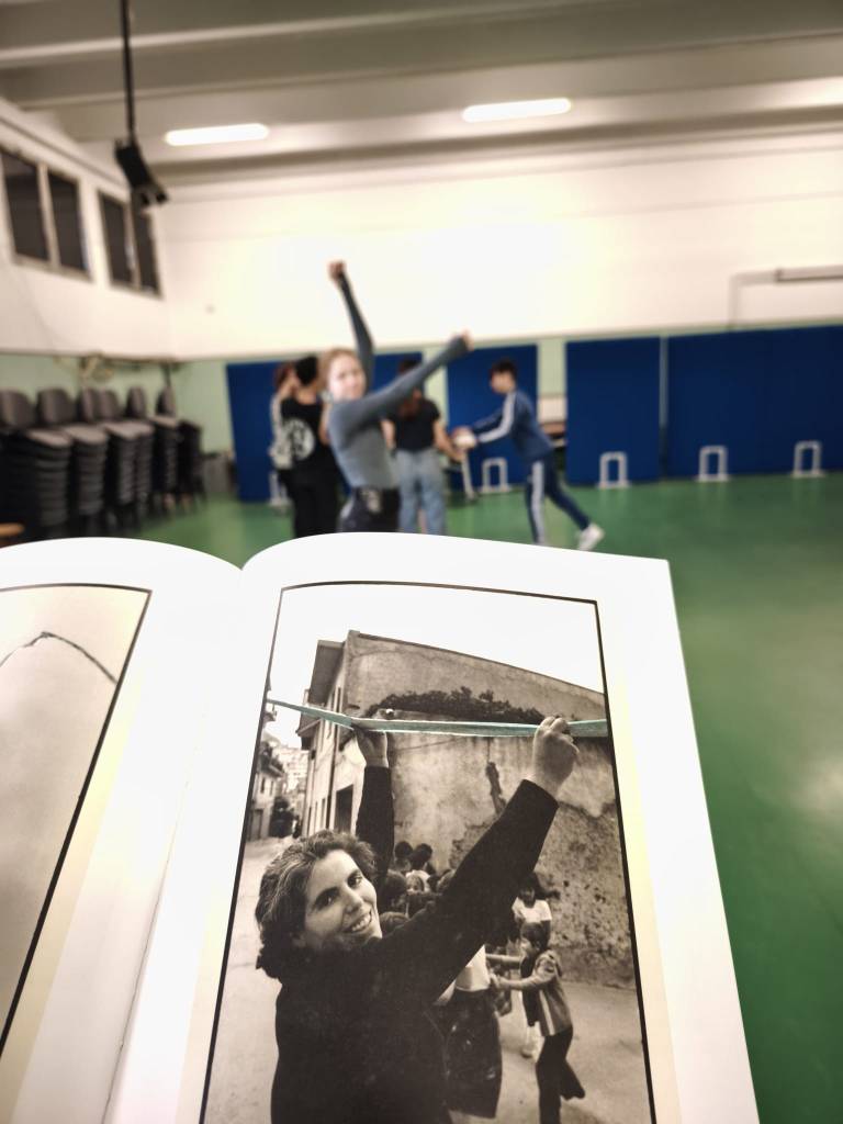 Per noi quel filo è stato dunque il teatro, cioè il ritrovarsi per due ore a settimana in un’aula di scuola — a volte una classe altre volte l’aula magna — a condividere del tempo insieme, senza banchi e senza sedie, con nessun altro strumento all’infuori del corpo. Durante il laboratorio ci siamo soffermate a lungo sulle possibilità creative che abitano i corpi, tentando di risvegliare in tutte e tutti loro il desiderio spontaneo di creare, come quando un bambino o una bambina giocano al gioco senza tempo del “facciamo finta che”. Un aspetto centrale della ricerca ha riguardato l’impiego di alcune fotografie scattate durante la performance di Maria Lai del 1981, che abbiamo deciso di integrare nel nostro copione. Così, le immagini che ritraggono i cittadini e le cittadine di Ulassai alle prese con il lungo filo blu realizzato a partire da alcuni vecchi jeans, sono diventate per noi una costante fonte iconografica durante tutto il processo creativo. A partire dall’osservazione delle posture ritratte nelle foto, le ragazze e i ragazzi hanno dato vita ad una nuova performance.