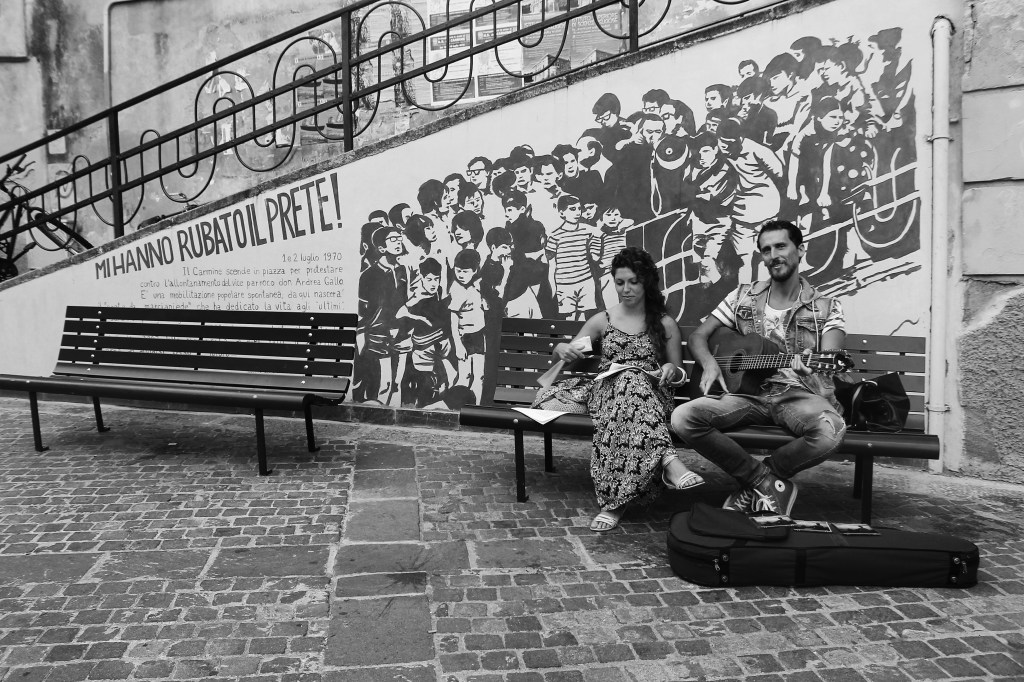 Piazza del Carmine. La scritta e il murale ricordano la cacciata del prete “di strada” Don Andrea Gallo dalla chiesa (situata alle spalle della scritta) per aver tenuto omelie troppo sovversive e politicizzate, nel 1970, e della manifestazione popolare a favore del sacerdote. Un bambino in piazza piangeva e, quando un vigile gli chiese perché, rispose: «Mi hanno rubato il prete»
