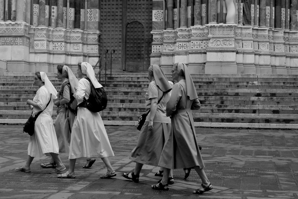 Piazza San Lorenzo. Suore di fronte alla scalinata della chiesa. La facciata bianca e verde costituisce uno dei monumenti più famosi e caratteristici della città