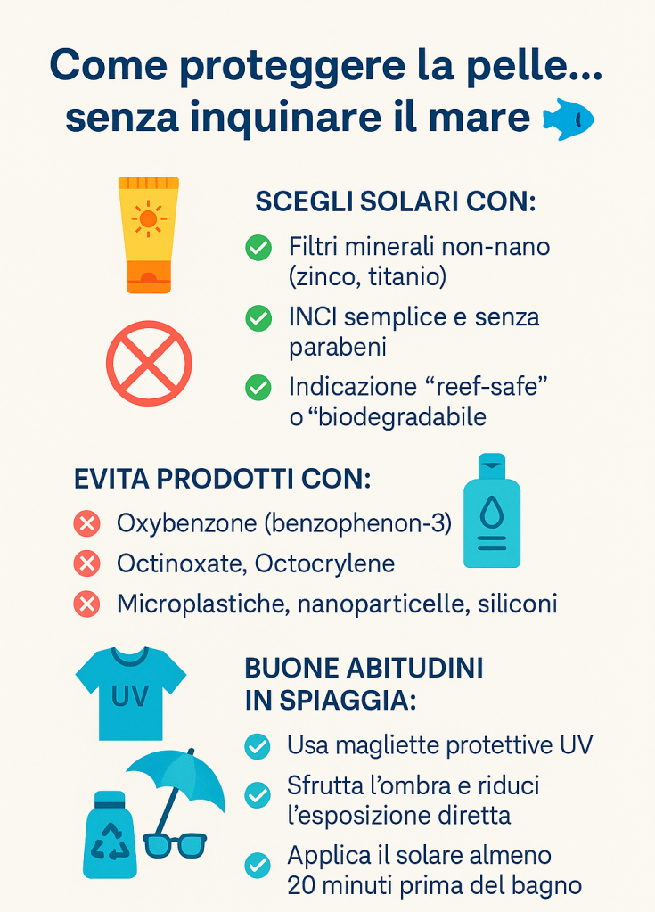 Ma alcuni filtri chimici contenuti nei solari — come ossibenzone e ottinoxato — possono avere effetti devastanti sugli ecosistemi marini, in particolare sui coralli, alterando i processi di crescita, riproduzione e fotosintesi.