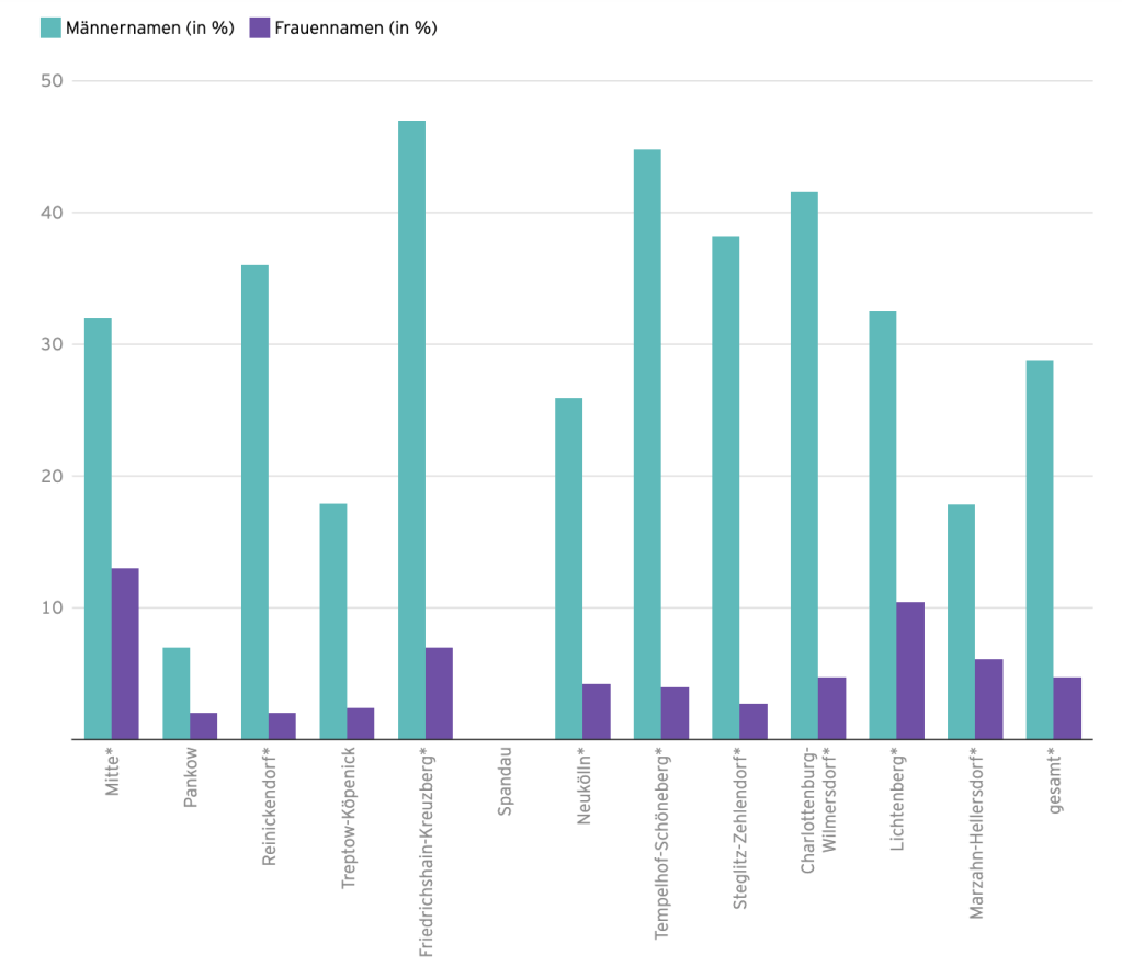 Secondo un recente sondaggio dell’Agenzia di Stampa Tedesca (marzo 2025), a cui hanno risposto tutti i distretti berlinesi tranne Spandau, la percentuale di strade con nomi femminili nei diversi quartieri varia tra il 2,3 e il 13%. I valori maschili sono a due cifre quasi ovunque e in 5 distretti oltre un terzo delle aree di circolazione è intitolato a uomini.