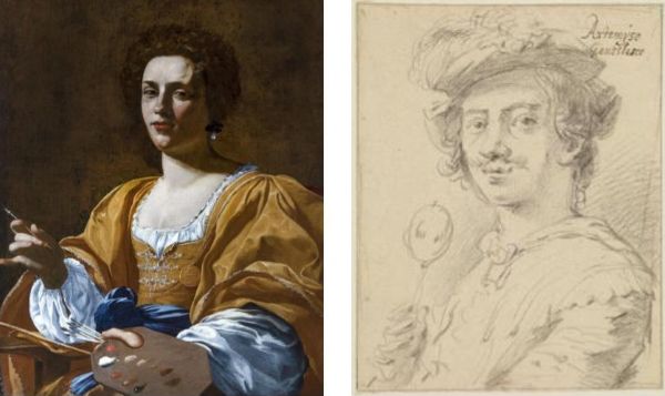 Notevole per la grazia dell’esecuzione è l’Autoritratto come Suonatrice di liuto (1614-1615) dal Wadsworth Atheneum Museum of Art di Hartford. L’artista si ritrae nel dipinto mentre suona un liuto, che nella simbologia pittorica degli artisti evoca armonia e bellezza, ma anche sensualità e voluttà. Dopo il ritorno a Roma nel 1620, Artemisia frequenta molti artisti “caravaggeschi”, fra cui alcuni francesi come Simon Vouet che ne ha tramandato l’immagine nel celebre ritratto di Palazzo Blu a Pisa. Qui Artemisia, posa — appena trentenne — come una donna e un’artista affermata, reggendo nella mano sinistra i pennelli e una tavolozza di colori. E Leonaert Bramer la disegna nel 1620 vestita da uomo con tanto di baffi, chiara allusione alla sua indipendenza. Un riconoscimento dello status raggiunto da una giovane donna, che viveva separata dal marito, Pierantonio Stiattesi, ed era a capo della sua bottega e della sua famiglia.