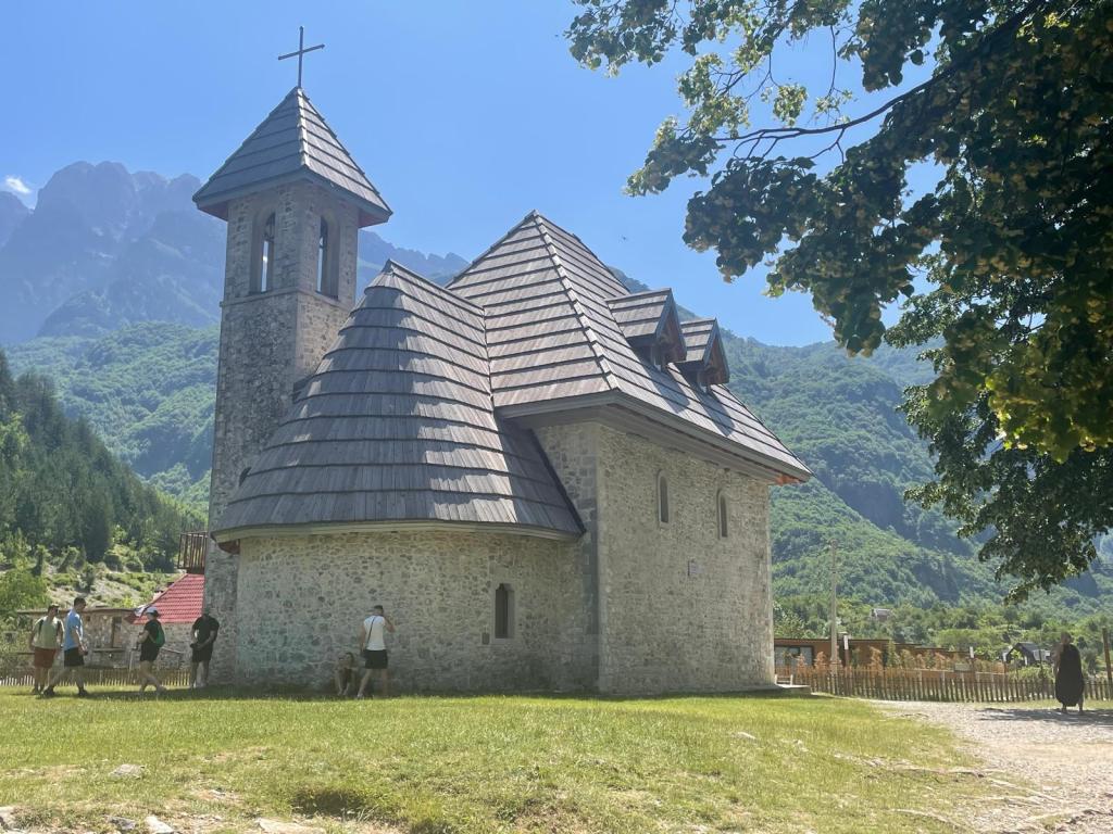 A Theth avevamo una prenotazione per due notti per poter godere del fresco della zona che offre belle passeggiate. Ottima sistemazione, molto cordiali i gestori, buono il cibo: una vera sorpresa per chi, come noi, non aveva mai visitato l’Albania. Io, in realtà ci avevo provato nell’agosto del 1980, ma la dittatura ne impediva categoricamente l’accesso; grande è stata quindi la mia gioia nello scoprire questa terra che ho trovato molto ospitale. Con una passeggiata, a pochi chilometri dall’albergo, mi sono trovata in fondo valle dove si può visitare una chiesetta con copertura in legno della fine dell’Ottocento, che reca una lapide a ricordo di un prete che nel 1917 avviò una scuola per gli abitanti della zona.