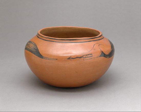 In questa ciotola un serpente cornuto, l’Avanyu, divinità Tewa, circonda la superficie centrale del vaso e con la lingua tocca quasi la punta della coda, muovendo il corpo tanto da sembrare vivo.