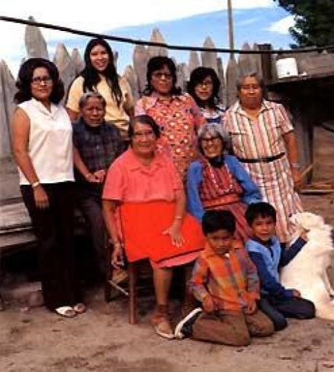 Maria espose la sua ceramica in ogni fiera mondiale fino alla Seconda guerra mondiale e formò tre generazioni di giovani della sua famiglia. Con la crescente domanda, si rese conto che il suo lavoro poteva arricchire artisticamente ed economicamente la vita dell’intero pueblo, e generosamente condivise le sue tecniche. In questa foto, scattata da Susan Peterson nel 1975, Maria è seduta, a destra con la sua famiglia a San Ildefonso. Cinque generazioni hanno continuato questa ricca tradizione di abilità artistica e design innovativo, ultima la pronipote, Barbara Gonzales, nella foto in piedi, maglietta gialla, con i suoi figli, Cavan e Aaron.