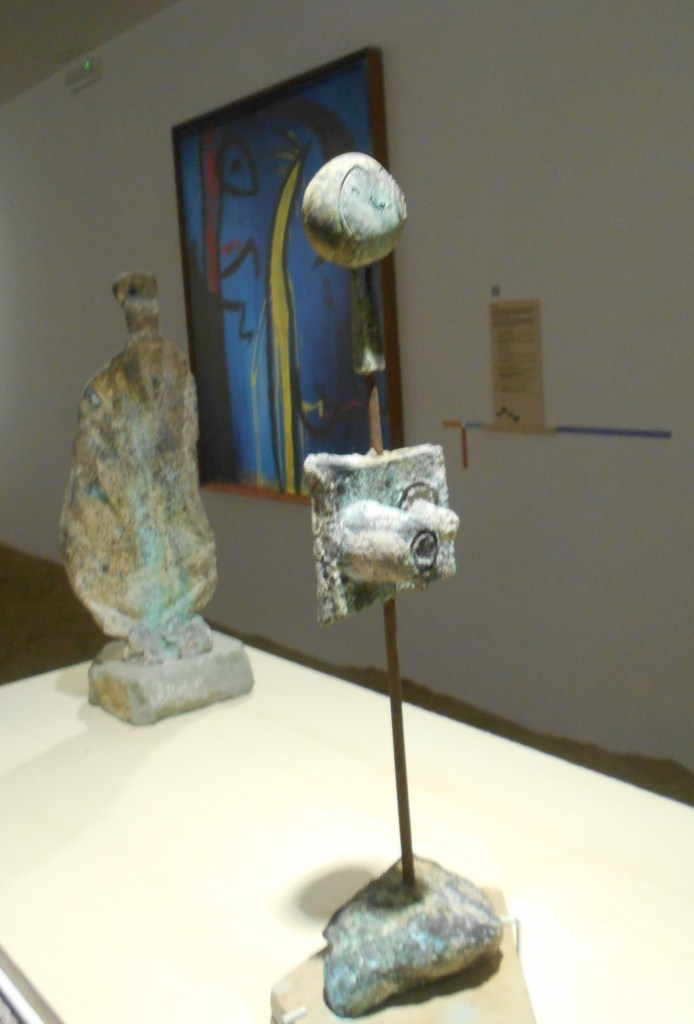 Non isola, dunque, ma terra lambita dal mare, come la Sardegna, e altrettanto aspra. Di Joan Miró, che reputava i moai dell’Isola di Pasqua suoi nuovi modelli scultorei, ammiriamo due piccoli lavori in bronzo: Donna con bel seno e Maternità, che non possono non collegarsi alla produzione di Giacometti, con le sue figure stilizzate, che così si espresse: «Tutta l’arte del passato, di tutte le epoche, di tutte le civiltà, si erge davanti a me. Tutto si fa simultaneo, come se lo spazio avesse preso il posto del tempo». Immediato il rimando ai bronzetti di età nuragica di cui l’Isola è stata generosa dispensatrice; qui ne troviamo alcuni, usciti dai vari musei archeologici locali.