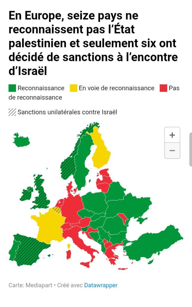 La prima domanda che viene da porsi è: che cosa sta riconoscendo l’Europa? Lo Stato legittimo con i confini stabiliti dall’Onu e che Israele viola dal 1967? O nient’altro che le briciole della Cisgiordania, tappezzata di insediamenti coloniali, illegali anche secondo la stessa legge israeliana, e le macerie della Striscia di Gaza, ridotta a un colossale cimitero e campo di concentramento?
