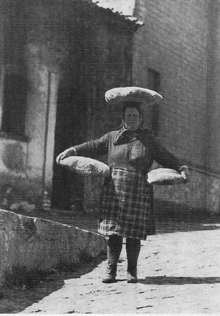 Dopo qualche tempo viene la fornaia e carica i cesti su una tavola che mette in precario — per noi, ma sicuro per lei — equilibrio sulla testa, protetta solo da un panno attorcigliato, e va al forno, dove il pane verrà cotto e fatto raffreddare per poi arrivare a casa e in tavola!