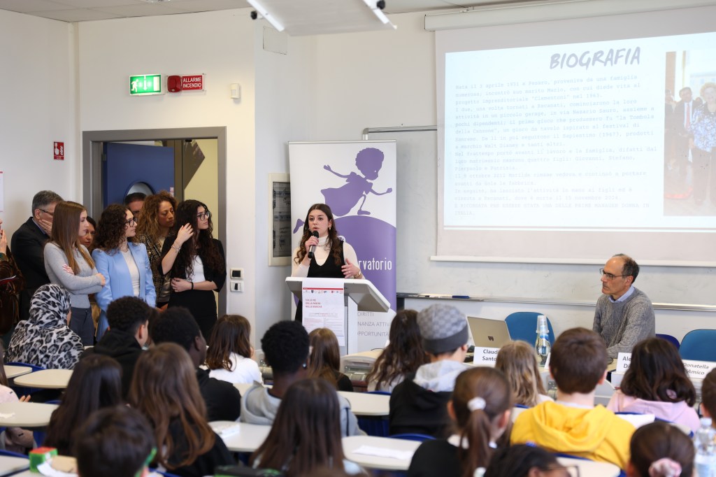 Tra le protagoniste analizzate, Matilde Brualdi — più nota come Matilde Clementoni e cioè con il cognome del marito — ha suscitato particolare ammirazione e coinvolgimento, tanto da ispirare una proposta concreta: l’intitolazione dell’aula di disegno del liceo proprio a lei. La scelta non è solo un omaggio simbolico, ma nasce da una riflessione profonda sul valore del lavoro creativo e sulla figura di una donna che, in un’Italia ancora lontana dalla parità, seppe affermarsi come prima manager donna in ambito industriale. Originaria di Recanati, Matilde fu mente progettuale e strategica dell’azienda Clementoni, contribuendo allo sviluppo di giochi educativi capaci di stimolare intelligenze e immaginazione. L’intitolazione dell’aula di disegno — luogo per eccellenza della creatività scolastica — intende ricordare proprio questo intreccio virtuoso tra lavoro, educazione e visione, e rappresenta un gesto di cittadinanza attiva, già formalmente proposto al dirigente scolastico prof. Ermanno Brancalente. Nella richiesta presentata al Dirigente la classe ha scritto: «In occasione della partecipazione al concorso “Sulle vie della parità nelle Marche”, vorremmo proporre l’intitolazione di un’aula della nostra scuola in onore di una donna che si è distinta nel suo ambito lavorativo ed è stata oggetto delle nostre ricerche online per questo progetto. Matilde Clementoni, originaria di Recanati, è stata la prima donna manager in Italia e lavorò nell’azienda produttrice di giochi “Clementoni”, segnando un importante passo verso la parità di genere. Desidereremmo intitolarle proprio l’aula di disegno, luogo in cui la nostra creatività può svilupparsi, come si è sviluppata quella della signora Clementoni».