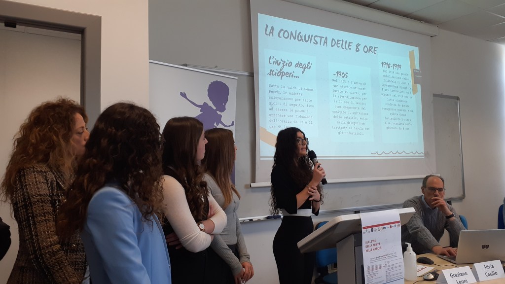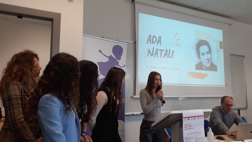 L’esperienza che ha portato alla realizzazione del progetto si è sviluppata nell’ambito dell’educazione civica, con riferimento all’Obiettivo 5 dell’Agenda 2030 sull’uguaglianza di genere, e ha previsto un percorso articolato in dieci ore di lavoro in classe, a cui si sono aggiunte numerose attività di ricerca svolte autonomamente da ragazzi e ragazze. Dopo una prima fase di lettura e discussione di testi narrativi incentrati su esperienze femminili complesse e significative — come Oliva Denaro di Viola Ardone, La malnata di Beatrice Salvioni, Come vento cucito alla terra di Ilaria Tuti e Grande meraviglia, ancora della Ardone — la classe è stata suddivisa in quattro gruppi, ciascuno impegnato nell’approfondimento della vita e dell’operato di una figura femminile marchigiana distintasi in ambito lavorativo: Elisa Comani, Ada Natali, Gemma Perchi e Matilde Brualdi.