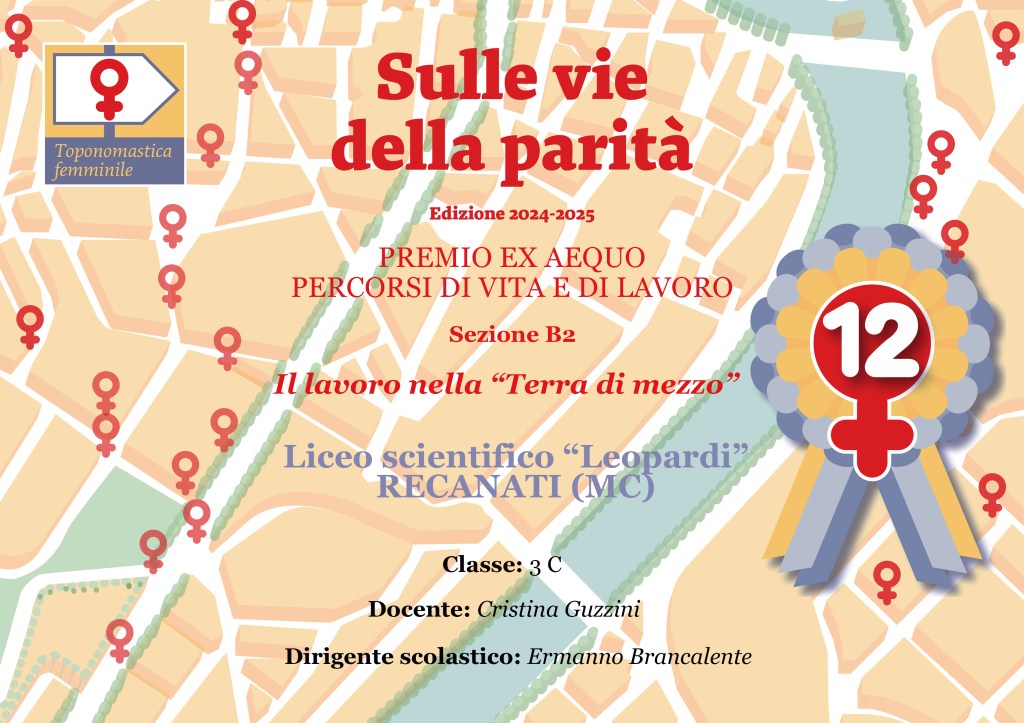 Continua il nostro viaggio alla scoperta dei progetti che nel corso dell’anno scolastico 2024-25 sono stati premiati sia a livello regionale nell’ambito del concorso “Sulle vie della parità nelle Marche” che nazionale. Oggi i riflettori si accendono sul Liceo Classico “G. Leopardi” di Recanati (MC) e in particolare sul progetto “Il lavoro nella terra di mezzo”, realizzato dalla classe 3ªC del Liceo Scientifico sotto la guida della professoressa Cristina Guzzini, che si è aggiudicato ex aequo il Premio “Percorsi di vita e di lavoro”, consistente in un abbonamento annuale alla rivista “Limes”, nell’ambito del concorso “Sulle vie della parità” indetto da Toponomastica femminile, con questa motivazione della giuria: «Il lavoro, con continui riferimenti al contesto in cui operarono e a documenti d’epoca, propone quattro professioniste che hanno svolto il ruolo di apripista ed esempio per altre donne negli stessi campi professionali: un’avvocata, una sindacalista, una sindaca e una manager legate al territorio. Dalla legge alla politica all’imprenditoria il filo comune che unisce le quattro donne è il territorio. Evidente è l’impegno con cui alunni e alunne hanno affrontato la ricerca. L’intitolazione proposta è all’imprenditrice Matilde Brualdi».