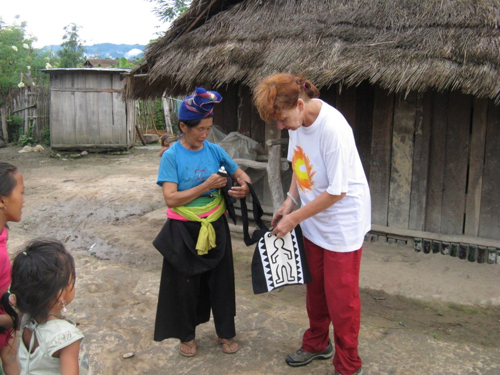 I villaggi visitati erano poverissimi, i bambini correvano seminudi nel fango, ma lì ho trovato una donna che vendeva i suoi lavori di cucito molto particolari e ho comprato una borsa con simboli in bianco e nero che continuo a usare ancora oggi.