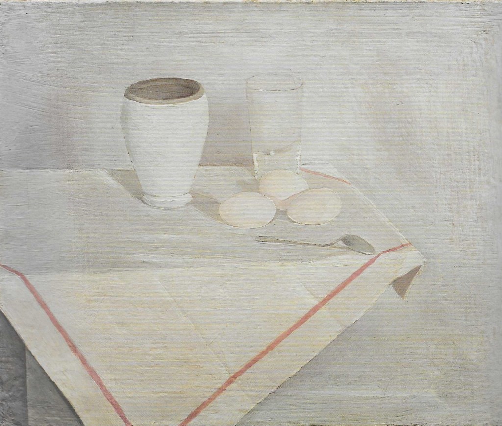 I suoi dipinti apparivano immobili e stranianti, pur nell’esattezza e nella purezza della forma, i colori sobri, nella chiarezza della luce, erano declinati in minime variazioni di estremo lirismo, come in Uova fresche realizzato alla fine degli anni Venti.
