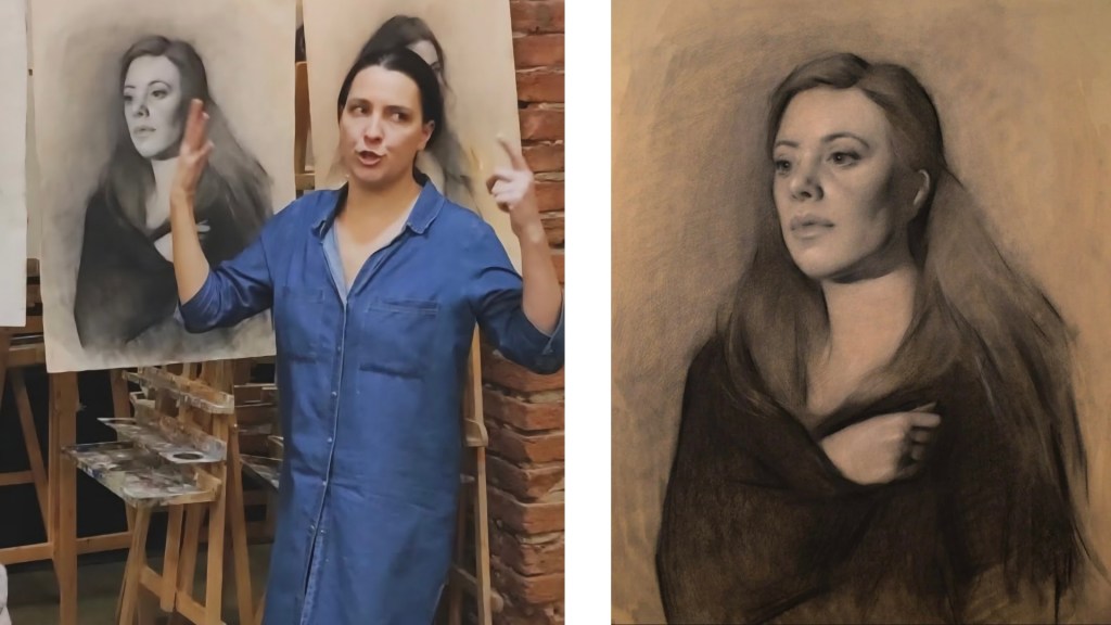 Negli atelier storici si possono ancora trovare podi antichi con la “ruota” (dove è possibile girare la modella o il modello con un meccanismo che muove il terzo superiore indipendentemente dalla base), altri moderni e fissi come piccoli palcoscenici, con sfondo di tessuto neutro nero, grigio, bianco, panna o color terra. In altri posti si sta in piedi su panche o tavoli. Più raramente, si posa allo stesso livello del gruppo che disegna, divise/i da una sorta di “parete invisibile” (situazione più frequente in una sketch class che ha spesso luogo in ambienti non originariamente destinati alla posa, ma riadattati per essa). E poi — funzionando da elementi evocativi necessari, come per la Madama Pace pirandelliana — ecco che entrano nel quadro tutti gli elementi che rendono viva la scena dipinta: panneggi di colori complementari a pelle e capelli, dei quali apprezzare le pieghe, abiti chiari che lascino scoperte le clavicole, viso struccato, capelli legati/semi legati… Ed eccoci catapultati nell’Ottocento. Si tratta di un processo magico che rende “visibile l’invisibile”, che dà forma e corpo a memorie, sentimenti, tracce di storia. Come se tra il podio, la tavolozza e la tela si consumasse una sorta di seduta spiritica. Non nel senso soprannaturale, ma energetico, artistico e psicologico: l’ambiente giusto trasmigra il corpo dalla realtà al dipinto, con un aspetto che avrà solo in quel momento della sua vita biologica, ma sulla tela sarà così per sempre. Invulnerabile alla vecchiaia, alla malattia e alla morte.