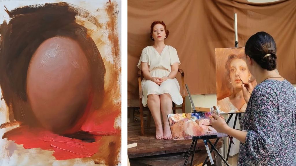 E — a parte i corpi — i volti (ciò che più assimiliamo all’essere chi siamo) che peso hanno? Che si fa coi volti di modelle e modelli, nelle pose d’arte? Entro in una sala dove si stanno inchiodando le tele ai telai, mentre altre sono già odorose dell’imprimitura color caramello (una base preparatoria di colore diluito con la quale si impregnano le tele). In un angolo della stanza c’è il master (lavoro dell’insegnante che serve da guida per chi segue il corso) con uno studio su luce e colore fatto raffigurando un uovo. È un procedimento propedeutico all’apprendimento del ritratto, si fa prima di ritrarre un viso “dal vero” (ritraendo modelli vivi, in presenza). Mi siedo, prendo i riferimenti per la posizione e, con un certo automatismo, il corpo mi si spezzetta in segmenti: parti da dipingere e parti da non dipingere. Ossia: cosa è immobile e cosa è mobile. Per una sessione di ritratto “alla prima” spesso artiste e artisti disegnano fino alle spalle, con lo stesso taglio che vorrebbe un primo piano fotografico, e tutto ciò che resta fuori può essere mosso. Per intenderci: posso muovere le mani, ma non gli occhi. O meglio, posso sbattere le palpebre, ovviamente, ma gli occhi restano “posati lì” come quelli di una bambola, a guardare lo stesso punto per 4 o 6 ore, a blocchi di circa 30 minuti. Sarebbe un’imposizione importante se non mi regalasse uno spazio privato e inaccessibile a chiunque. Mi metto in posizione… e poi, con la mente, vado a scrivere. Aspetto le pause per appuntare tutto sulle note del telefono mentre mi sgranchisco. Il tempo di posa è diventato la mia “stanza solo per me”, per citare Virginia Woolf. Uno spazio creativo protetto, dove nessuna persona può entrare. Il timer che suona è la chiave con la quale si apre e si chiude la serratura di quella stanza interiore.