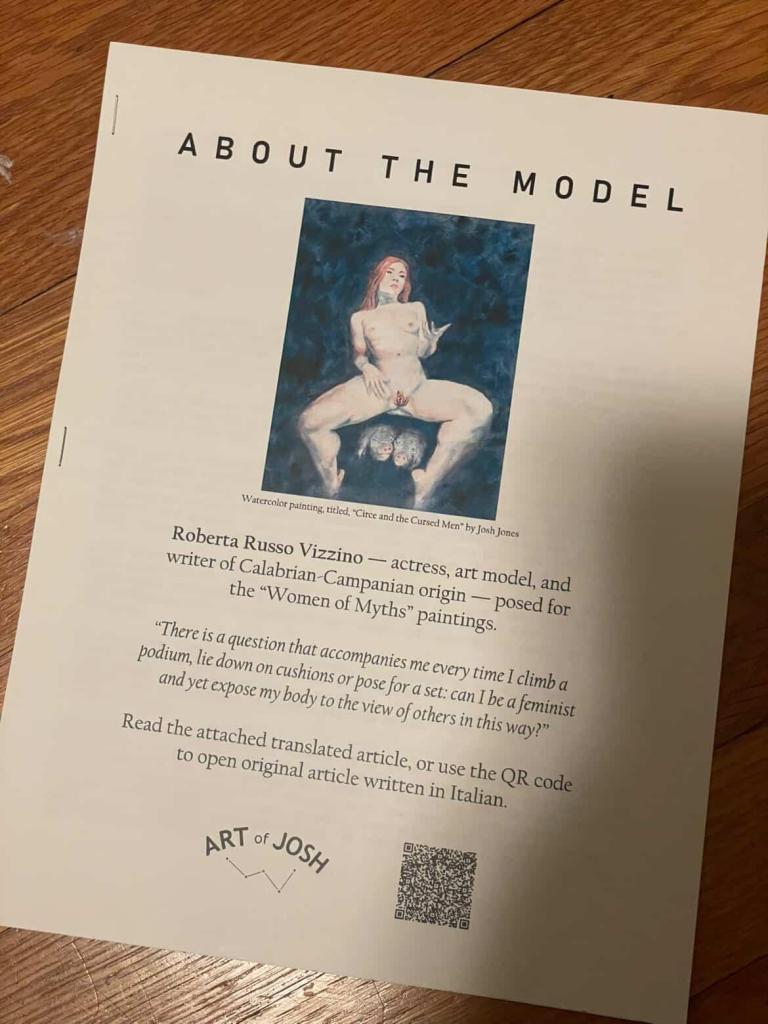 Se il mio corpo ha così tanto peso in questo processo, chi decide che valore ha il suo uso in termini economici? Il mercato, l’istituzione, l’insegnante/artista, io stessa su base di abilità, sensibilità, erudizione ed esperienza. Ognuna/o ha libertà di negoziare il proprio ruolo. Non svendersi mantenendo elasticità è fondamentale. Chi decide cos’è bello? La bellezza nell’arte è fatta di proporzioni, contrasti, dinamismo, plasticità, giustapposizione di colori complementari e alternanze calde e fredde. Fortunatamente, non ha un punto di vista che si arroga oggettività. Chi stabilisce le regole? Vecchi codici estetici che ancora pesano sui nostri corpi, prevalentemente. Nettuno, Apollo, Venere o Dafne sono archetipi che tramandano pose e atteggiamenti fino a farli interpretare a noi, in epoca digitale. Con l’importante differenza che qui, le piccole difformità sono proprio ciò che rende i corpi più artisticamente “interessanti”. Corpi reali, senza dubbio, ma che non includono ancora abbastanza spesso i corpi considerati non conformi. A volte, chi abita quei corpi, posa, ma non vuole vedere i disegni finiti. Corpi grassi, anziani, disabili, queer sono purtroppo tuttora una rarità, una variazione ciclica rispetto ai corpi intesi come aderenti al canone accademico: atletico, snello, giovane, abile. Che sia o meno un fatto di disponibilità maggiore di modelle e modelli stesse/i a mostrarsi di più con quei corpi è una valutazione che viene fatta in modo talmente silenzioso e individuale, che non mi è dato saperlo. Tutto il processo è sempre uguale a sé stesso o il rapporto tra chi posa e chi crea cambia a seconda della differenza sessuale? E — se sì — in che consistono eventuali cambiamenti? La differenza sessuale e di genere può non essere il fattore determinante, ma resta sullo sfondo come struttura di potere. Posso senz’altro dire di aver lavorato con artisti femministi. Alleati autentici con i quali ho avuto spazio per scambiare impressioni sulla composizione delle immagini finali, anche reinterpretando o ribaltando codici apparentemente fissi. Uno su tutti: Josh Jones. La serie Women of Myths, che è appena stata in mostra allo Snohomish Studio di Washington, è stata accompagnata, per suo volere, al mio nome completo dei due cognomi e a un QR code contenente la prima parte del presente articolo. Con questa serie abbiamo lavorato (lui dipingendo gli acquerelli, io posando, ed entrambi parlando) a una rappresentazione delle protagoniste del mito che le vedesse centrali e vincenti.