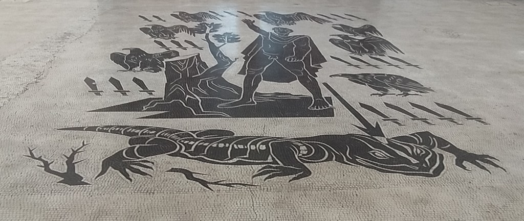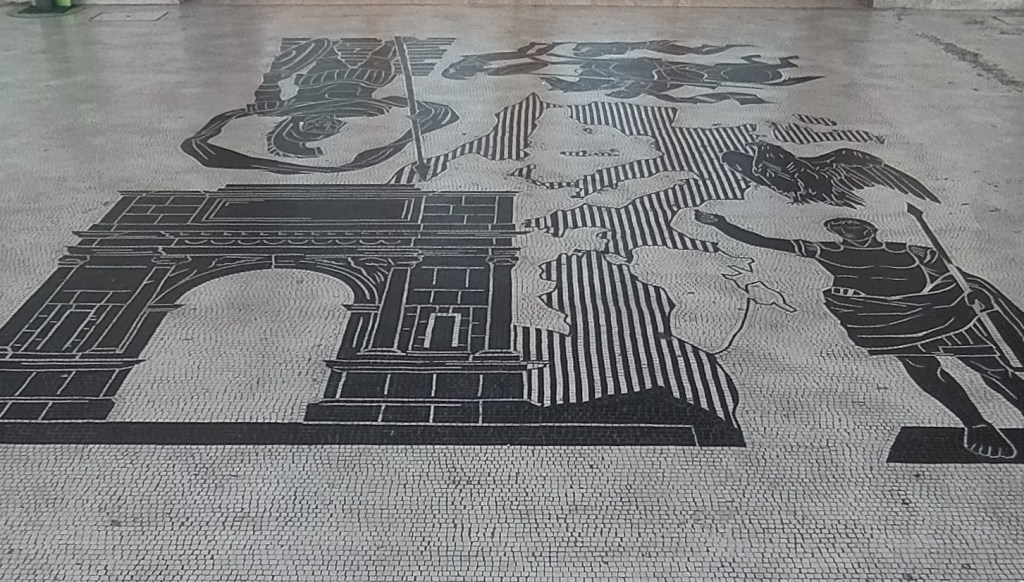 Le scene, organizzate in riquadri allineati, furono realizzate con tessere in ceramica bianca e nera, e non col più nobile e tradizionale marmo, a formare un percorso storico-celebrativo che dalle origini mitiche di Roma ripercorre il ruolo centrale e millenario della città nella storia, prima centro dell’impero e in seguito fulcro del mondo cattolico e successivamente dell’era fascista. Ancora appare incerta l’attribuzione a Rosso o a Zaffuto di ogni singolo riquadro, ma la partecipazione della pittrice è accertata dai documenti, anche se il nome di Maria Immacolata resta spesso in secondo piano (quando non taciuta) rispetto al nome di Giulio Rosso, considerato l’interprete del progetto.