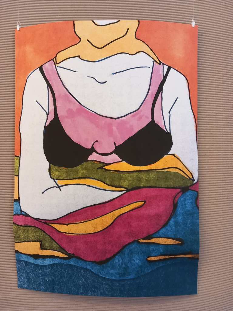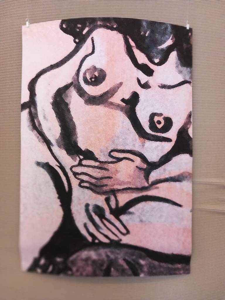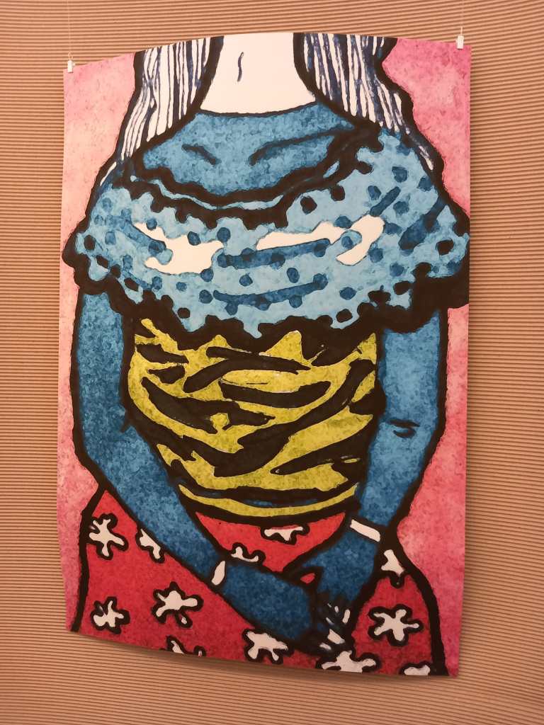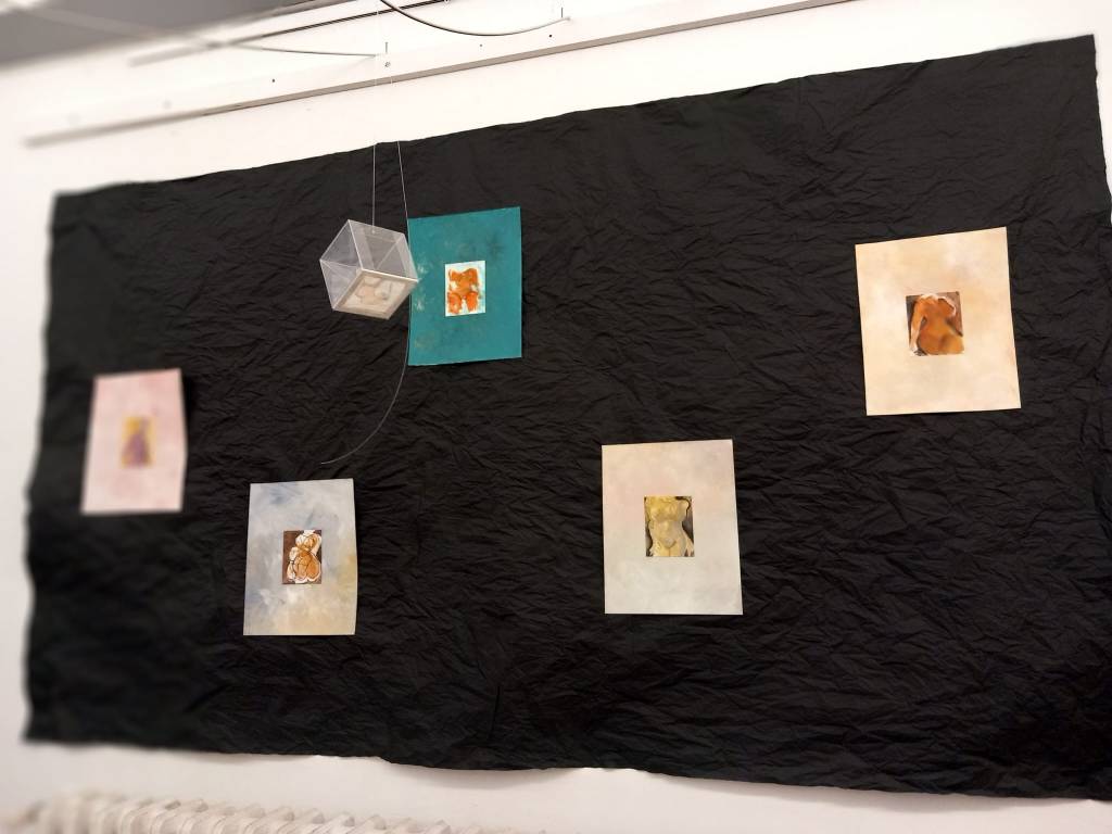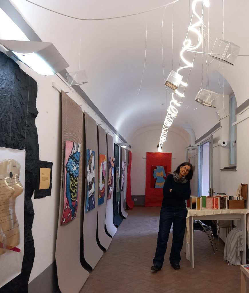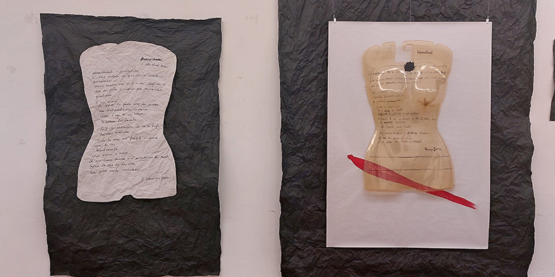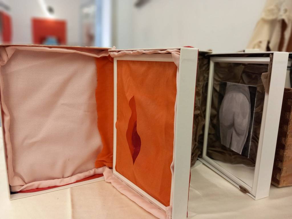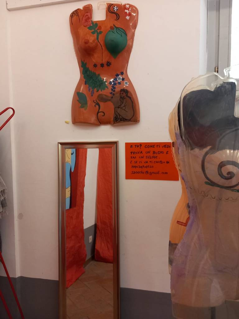 La mostra, collocata nella Sala “Liliana Ingargiola”, si presenta come un’esperienza immersiva e movimentata in cui l’artista modula e declina i suoi punti di vista sul corpo con le suggestioni, le ricerche e gli scritti di altre donne artiste e scrittrici entro una dimensione plurale e praticando una varietà di linguaggi. Ci si aggira fra opere singole o raggruppate in sequenze realizzate utilizzando tecniche e materiali molteplici quali dipinti su carta, busti in plastica decorati con colori acrilici e carte, sovrapponibili e indossabili, stampe, telaietti di diapositive in scatoline trasparenti che pendono dall’alto, dipinti su cartone, fogli di acetato con dipinti monocromi e specchi riflettenti, scatole formato vhs semiaperte che lasciano intravedere immagini o allusioni erotiche tese a provocare la curiosità e a spingere chi guarda ad aprirle per scoprirne il contenuto.