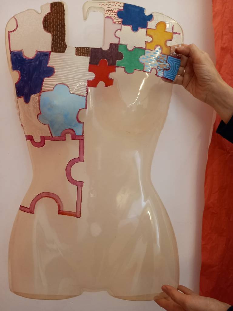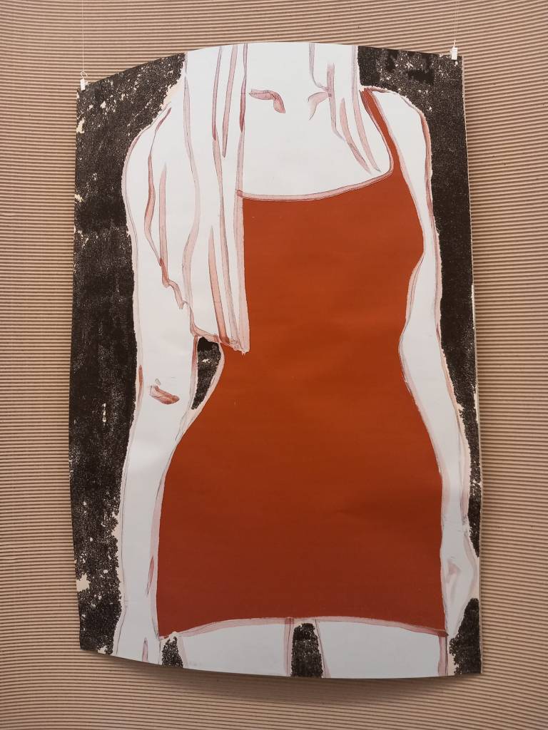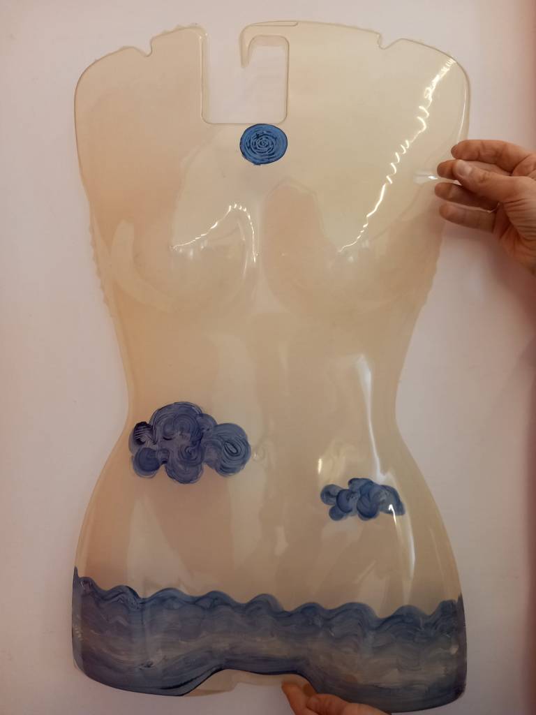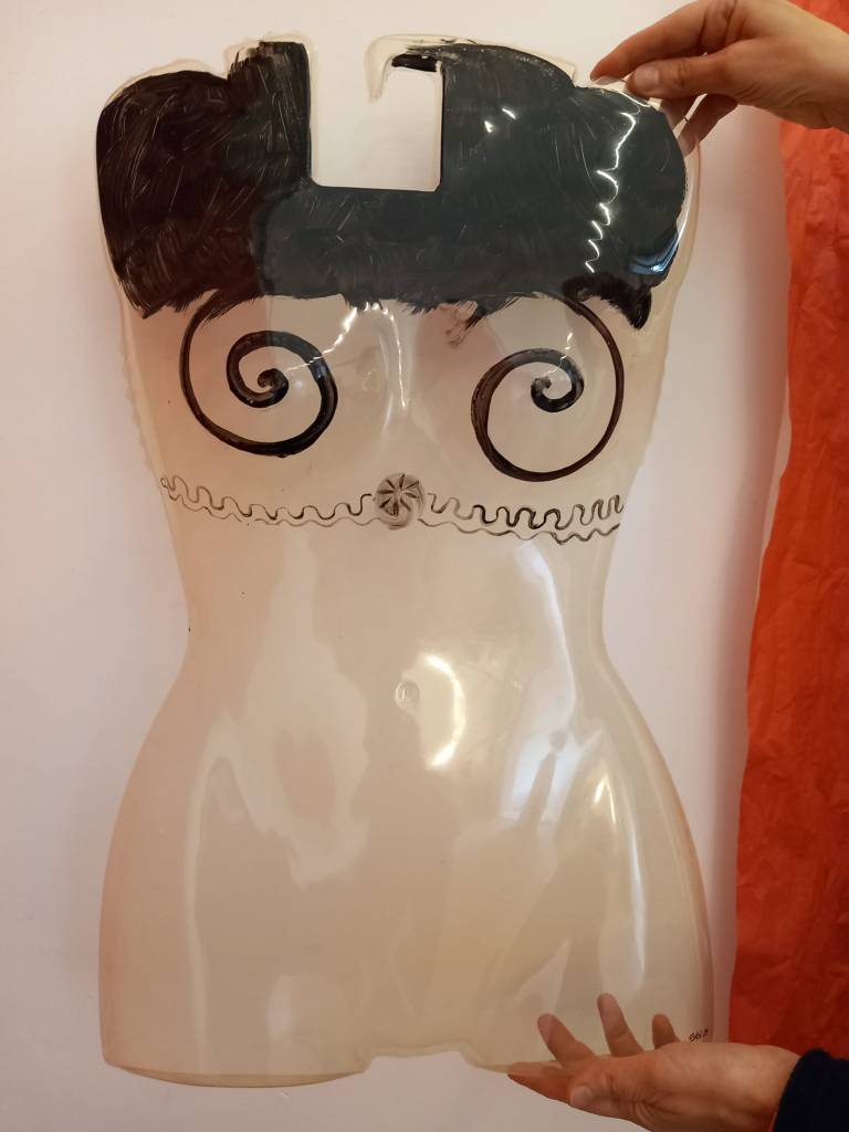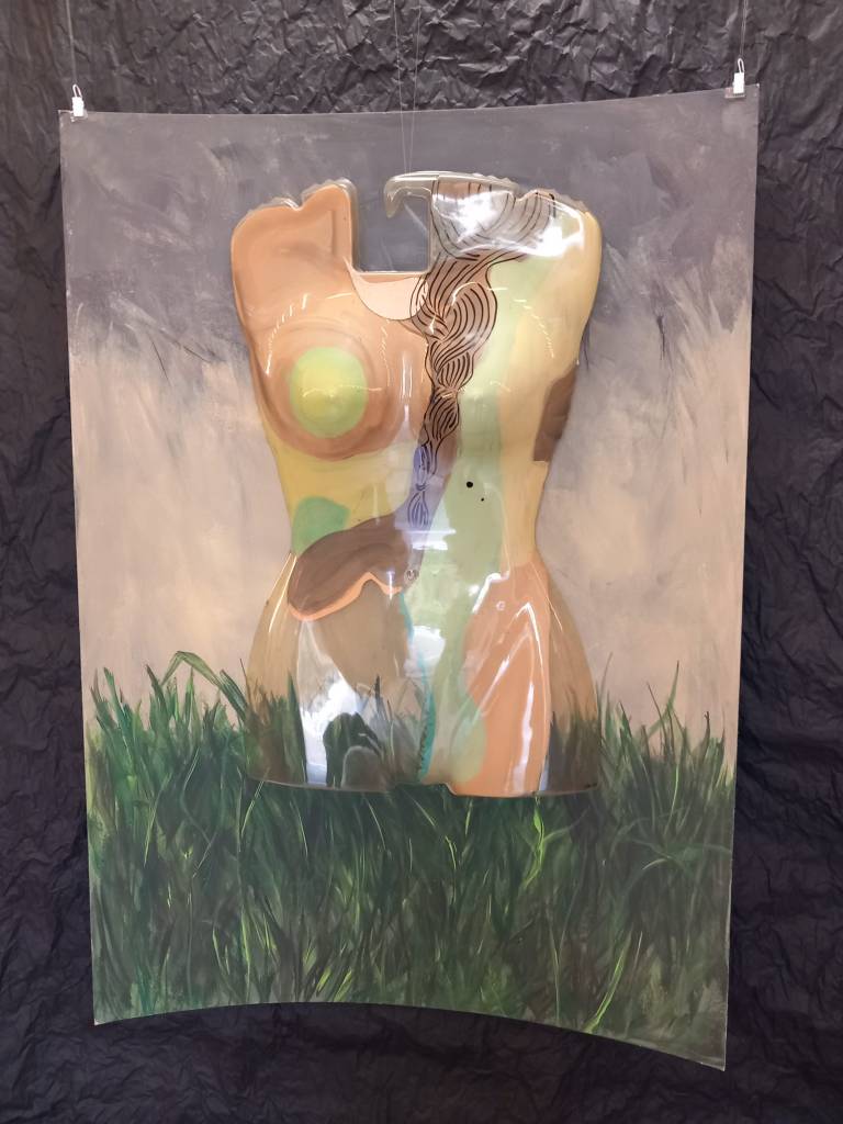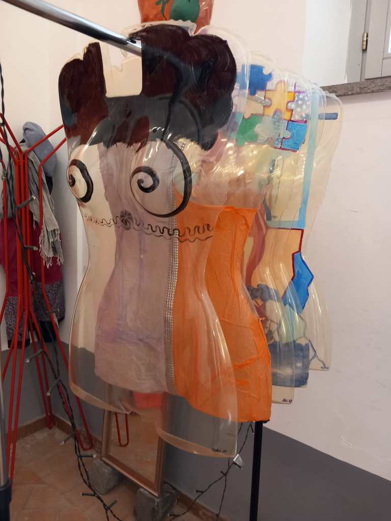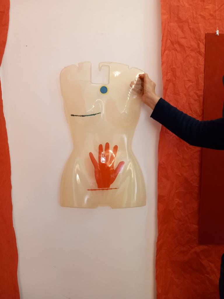 In fondo alla sala, alla fine del percorso espositivo, busti di plastica vivacemente colorati e sospesi a un appendiabiti interpretano altri modi di essere e/o di sentirsi dei corpi.