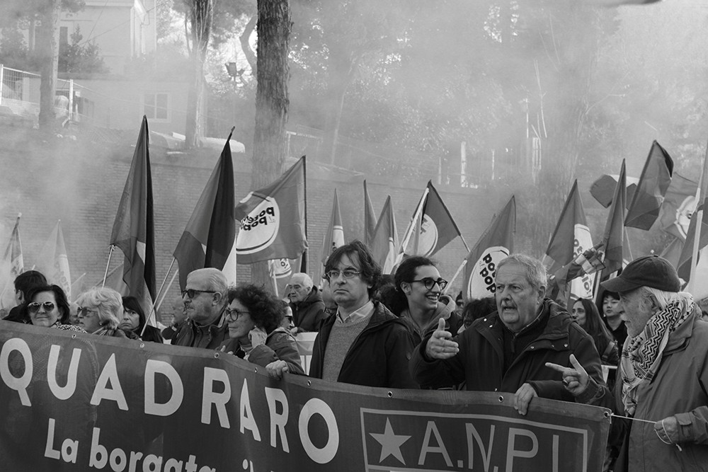 A seguito della conferenza, il centro di Roma, da Parco Schuster (per i movimenti) e Porta San Paolo (per partiti e associazioni) fino a piazza San Giovanni, è stato attraversato da un corteo ostile a Israele e alla complicità europea con i suoi crimini. In prima fila camminavano le figure già citate che sono state protagoniste della conferenza. Criticando in particolare la finanziaria italiana, la manifestazione chiedeva la rottura totale dei rapporti commerciali con lo Stato ebraico genocida. Vari Paesi hanno già fatto questo passo: il Brasile ha interrotto la compravendita di armi con Israele, la Cile ha vietato l’importazione di qualsiasi merce prodotta nei Territori palestinesi occupati illegalmente, la Colombia ha espulso la delegazione diplomatica israeliana, la Spagna ha vietato l’accesso sul proprio territorio a soldati e soldate dell’IDF anche se non in servizio e il Belgio ha recentemente arrestato alcuni criminali di guerra in vacanza sul proprio territorio. Varie scritte nella manifestazione romana accusavano Leonardo, azienda bellica italiana le cui armi continuano a fare strage di civili palestinesi; la sede di via Labicana del supermercato Carrefour, ditta francese al centro di una campagna internazionale di boicottaggio in quanto nutre l’IDF, ha abbassato le serrande al passaggio della folla antisionista; le lattine della solidale Cola Gaza sostituivano quelle della sionista Coca-Cola; le copie del quotidiano il manifesto, dalla parte dei diritti umani e della giustizia sociale, facevano da contraltare a La Stampa, da sempre schierata con chi pratica il mestiere delle armi.