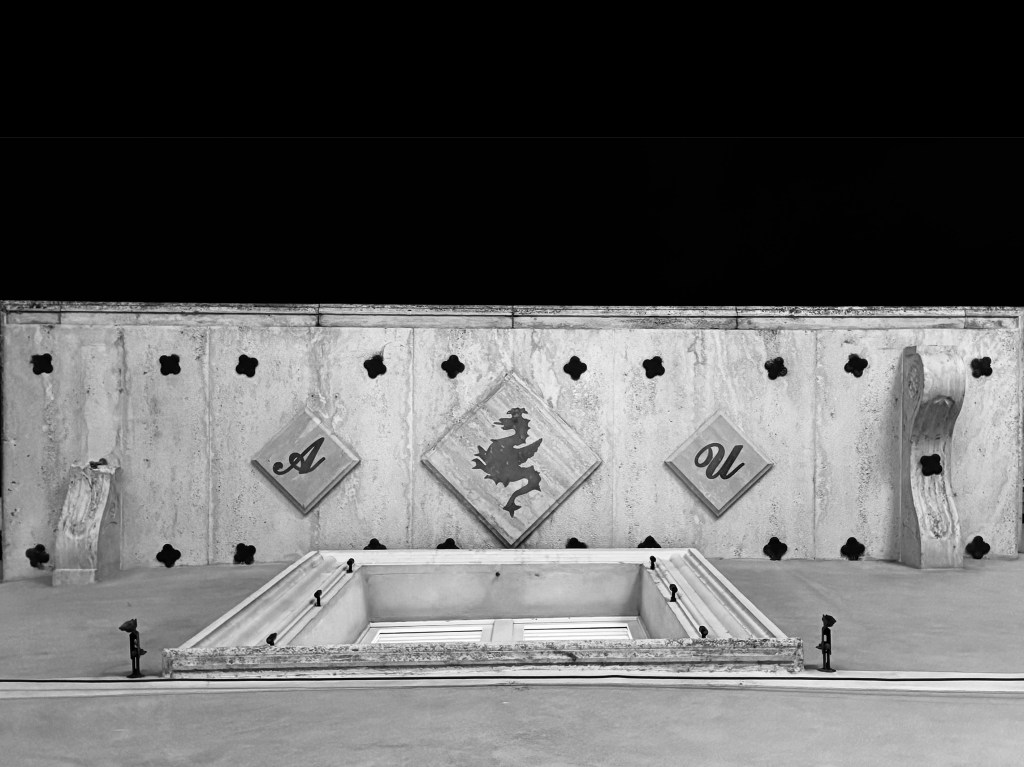 Vi è rappresentato lo stemma della città, il drago, insieme alle iniziali delle famiglie proprietarie del palazzo.