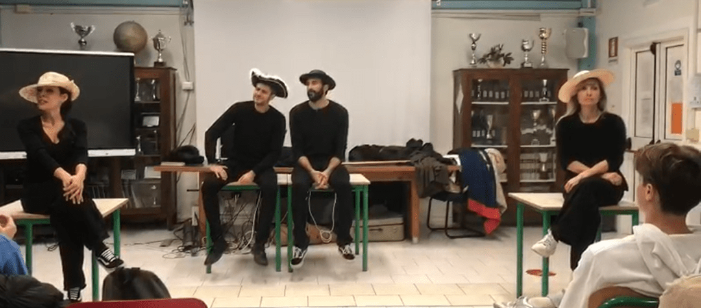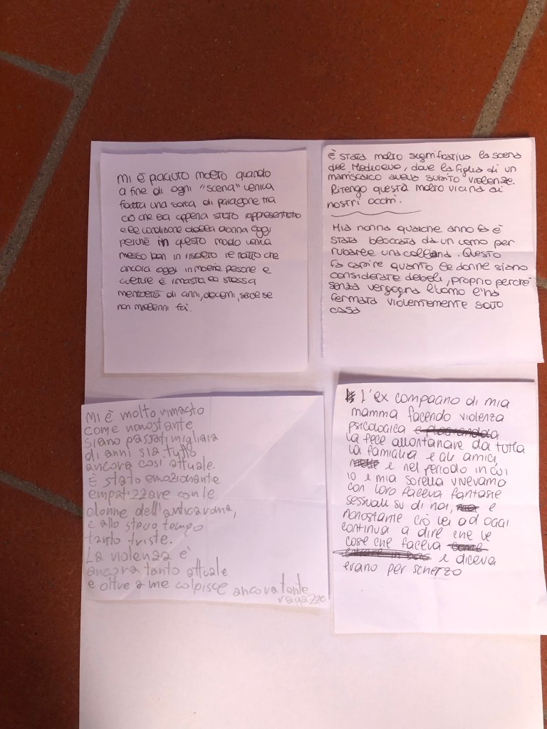Al termine dello spettacolo, ricordando che oltre alle violenze rappresentate vi sono altre forme di violenze più subdole, sfuggenti alla nostra consapevolezza e forse per questo più pericolose, le operatrici ed esperte di Toponomastica femminile Paola Malacarne e Ilaria Favini hanno avviato un dibattito in merito che potesse favorire lo scambio di idee e la riflessione. Usando la strategia dei bigliettini, i ragazzi e le ragazze sono state coinvolte e invitate a partecipare, scrivendo sui riquadri di carta distribuiti a ciascuno di loro, impressioni, riflessioni, ciò che li ha colpiti maggiormente e perché, e riportando qualche forma di violenza che hanno subito, ascoltato o a cui hanno assistito.