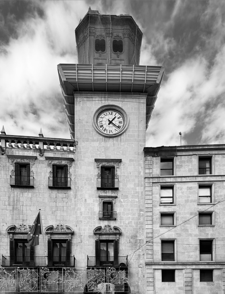 Dettaglio ingresso del Municipio storico di Alicante, noto come Ayuntamiento. È uno degli edifici simbolo della città, riconoscibile per le sue due torri di 41 metri che dominano la città vecchia. Al suo interno ospita sale decorate, una cappella, opere di artisti locali, gli uffici comunali e una mostra archeologica permanente.