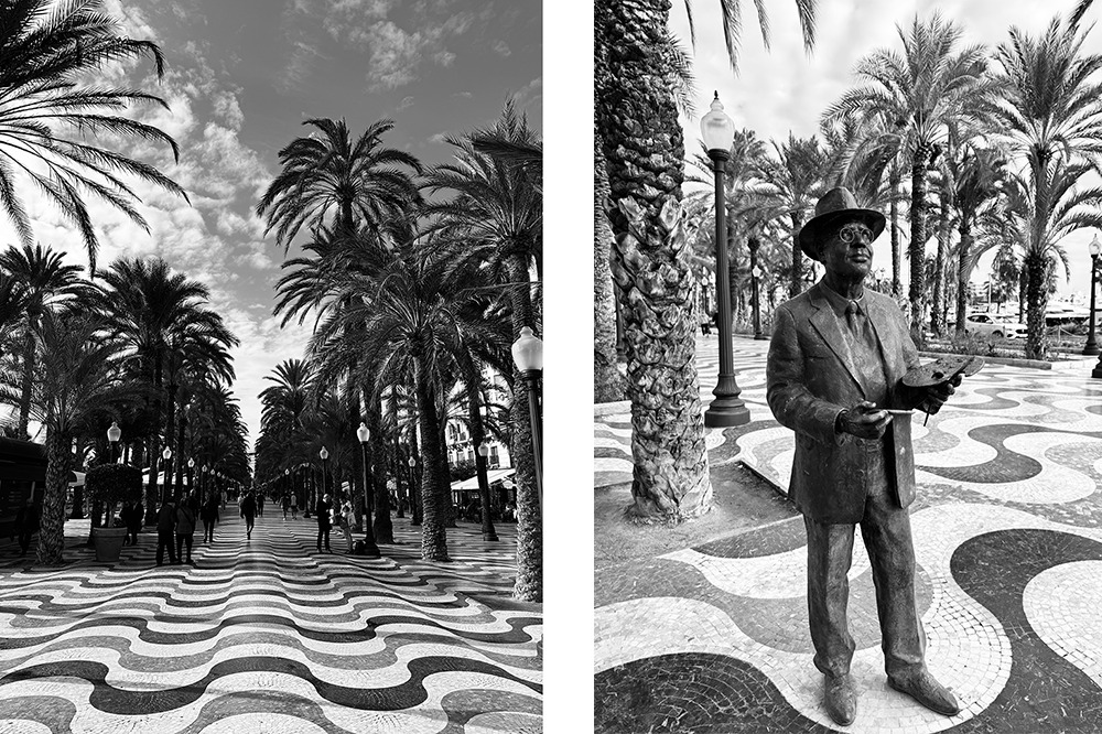 L’Esplanada de España è il celebre lungomare di Alicante, simbolo della città, caratterizzato da un mosaico ondulato in marmo e da quattro file di palme lungo 500 metri, molto frequentato a tutte le ore per passeggiare, rilassarsi, osservare la vita cittadina e godersi l’atmosfera che cambia dal mattino alla notte. Lungo la passeggiata è possibile vedere diverse sculture, come quella di Emilio Valera. L’opera raffigura l’artista con tavolozza e pennello mentre si appresta a dipingere il celebre viale con le palme, soggetto ricorrente della sua produzione.