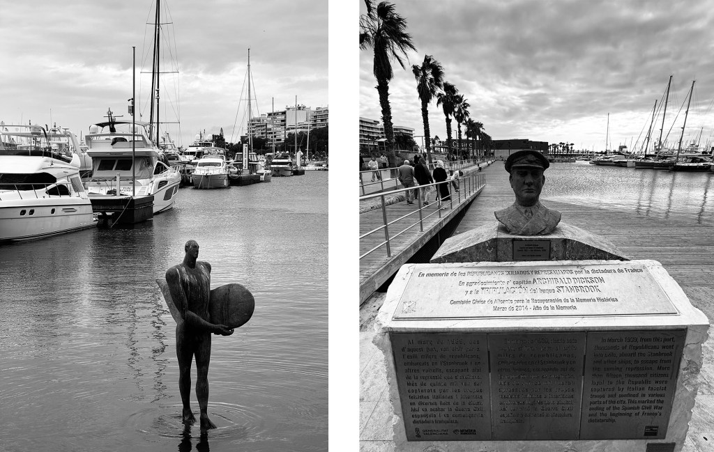 Il porto di Alicante è un importante scalo marittimo e uno dei principali luoghi di vita della città, con aree pedonali, locali e collegamenti con le Isole Baleari e il Nord Africa. Al suo interno si trovano anche due elementi simbolici: una scultura in bronzo di Esperanza d’Ors, collocata nell’acqua alla base della Escalera de la Reina, che rappresenta il mito di Icaro e il suo sogno di volo, e il monumento dedicato ad Archibald Dickson, capitano della SS Stanbrook, che nel 1939 salvò oltre 2.000 rifugiati repubblicani portandoli da Alicante ad Orano, gesto di grande coraggio durante la Guerra Civile Spagnola.