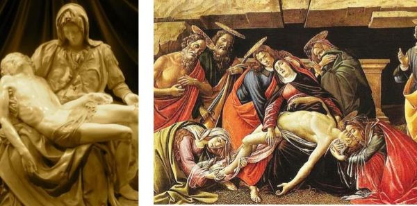 La figura femminile più presente nell’arte, almeno fino a qualche secolo fa, è senz’altro quella della Madonna. E la cosa non meraviglia, come ben sappiamo noi che abbiamo fatto l’esperienza di Toponomastica femminile: è anche il nome più frequente nelle intitolazioni stradali dedicate alle donne. La sua figura può essere considerata un tramite tra l’umano e il divino, una donna terrena che partorisce il figlio di Dio, un potente strumento di comunicazione tra i due mondi. Spesso rappresentata come madre amorevole, è vista come un’intercessora a cui si rivolgono i fedeli per ottenere grazie da Dio, ma ci sono anche tante Madonne sofferenti, che piangono e si disperano per la morte del figlio. Le immagini che la ritraggono ispirano la devozione nei fedeli, fungendo da veicoli per l’esperienza spirituale, celebrano l’aspetto divino, ma anche l’umanità.