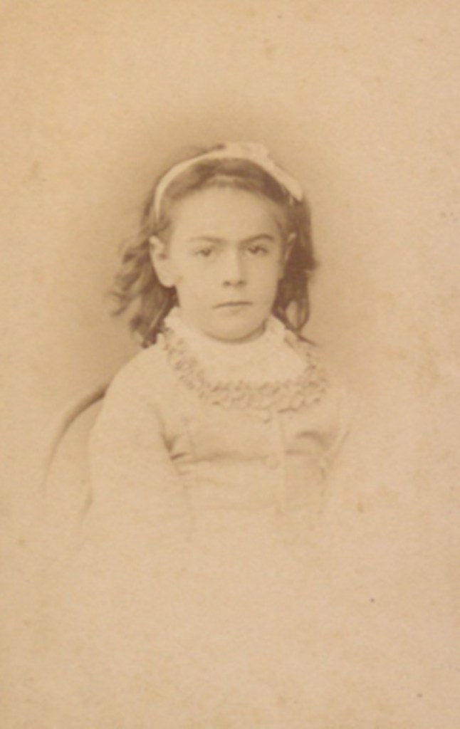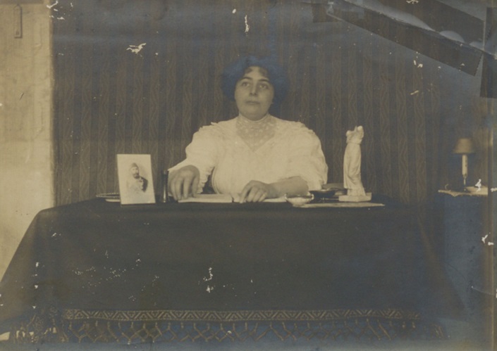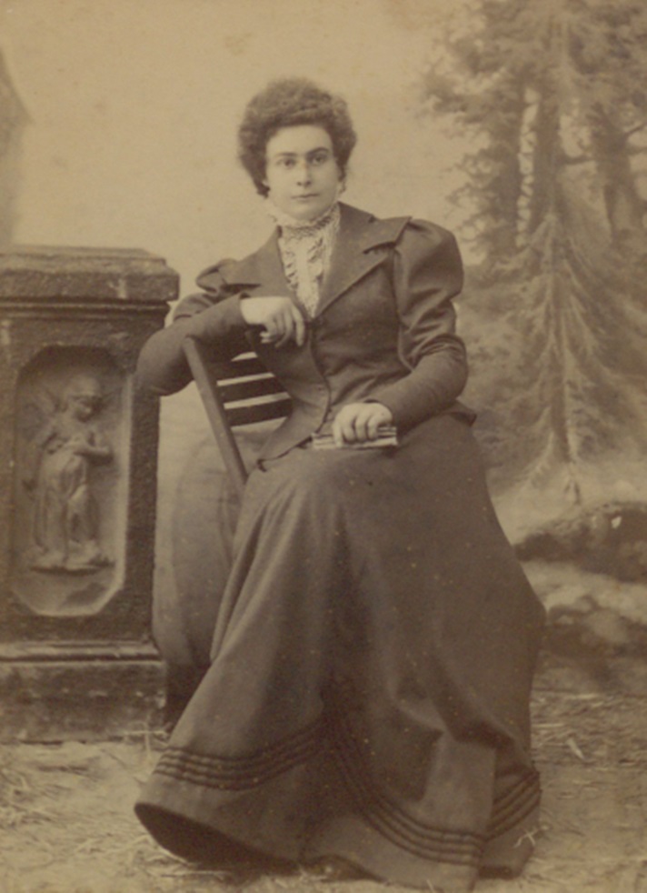 Una vecchia fotografia ci restituisce la sua immagine da giovane, seduta a uno scrittoio con la penna fra le dita e il calamaio in bella vista. Lo sguardo fiero è rivolto senza timore verso l’obiettivo del fotografo.