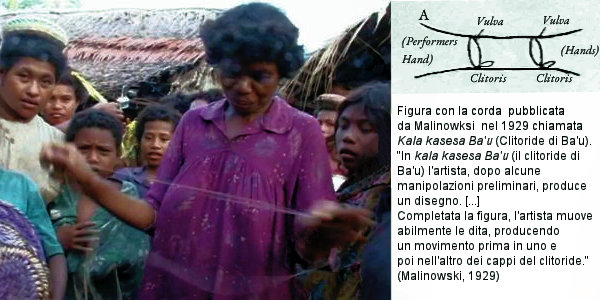 Praticante che realizza la FCLC magiaweda (pipistrello) nel villaggio di Kaulaka, isole Trobriand, fotogramma dal film di C. Benhamou, 2007, da Vandendriessche, 2014. A fianco: figura detta Kala kasesa Ba’u (la clitoride di Ba’u) da un disegno di Malinowki 1929.