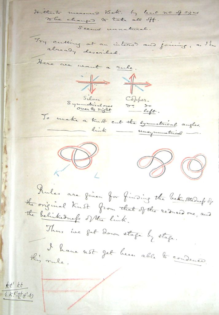 Pagina del manoscritto di Tait in cui si discute la “nodità” (knottiness) e la “innodità” (beknottedness), con riferimenti al rame e all’argento — elementi che Maxwell trasfigura poeticamente nella sua poesia