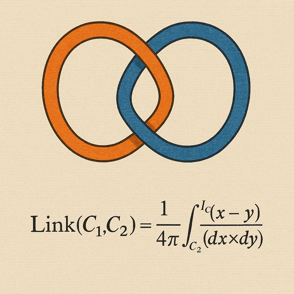 Integrale di Collegamento di Gauss. Si ha: Link (C1, C2) rappresenta il GLN delle curve 𝐶1 e 𝐶2; è la costante di normalizzazione; ∫C1𝐶2 indica un integrale doppio sulle le due curve. I𝐶(𝑥−𝑦) rappresenta il vettore dal punto y su C2 al punto x su C1; (𝑑𝑥×𝑑𝑦) rappresenta il prodotto vettoriale degli elementi differenziali lungo le curve 𝑑𝑥 e 𝑑𝑦. L’integrale calcola quante volte le due curve C1 e C2 sono intrecciate o collegate tra loro. L’integrando è correlato all’angolo solido sotteso da una curva in un punto sull’altra.