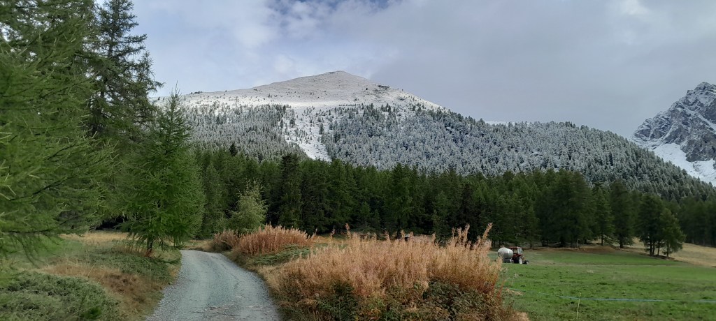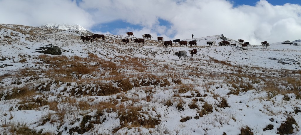 In assoluta solitudine, incontro sul cammino solo una mandria di una ventina di manzi che, preannunciati dal suono dei campanacci, in autonomia scendono nella neve fresca dal colle Bringuez, metri 2660, senza essere guidati dal berger, il pastore e dai cani. Ecco che ritorna la Kuasneea, la neve delle vacche.