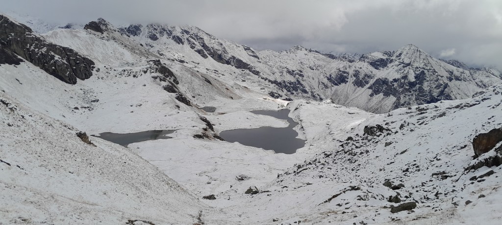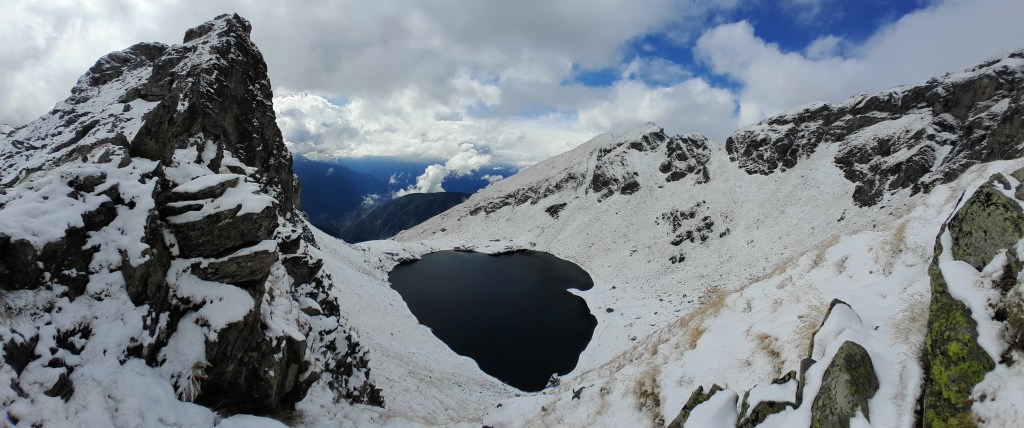 La discesa verso il Lago Pocia e poi quello della Battaglia è tutta in una spanna di neve fresca. Lo sguardo va in alto, alla cresta innevata del Corno Bussolaz, metri 3023. Quante volte in questi anni ho percorso il magnifico anello e la facile cresta che regala dei grandi panorami su buona parte dell’arco alpino della Valle d’Aosta.