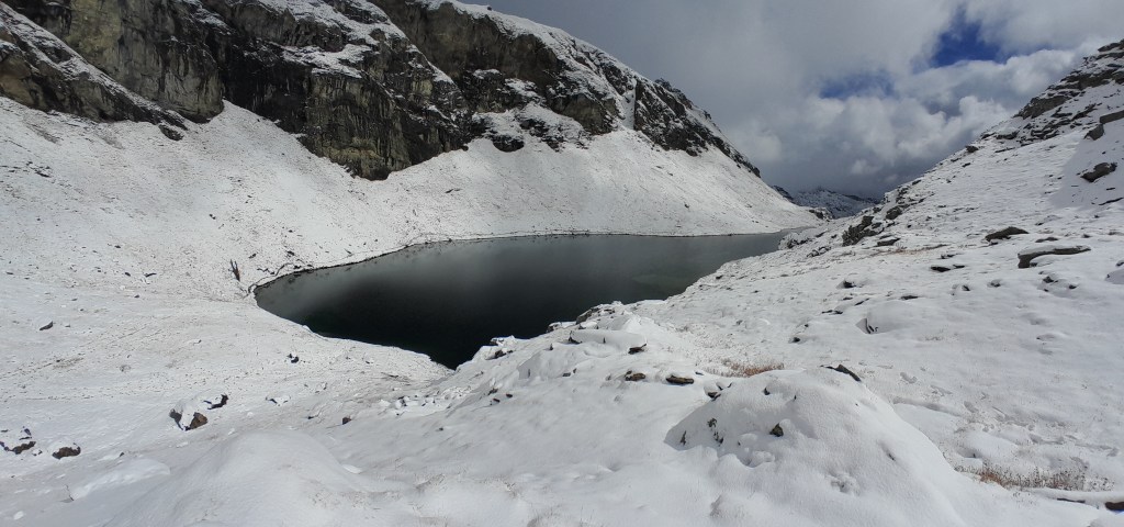 Davanti, a tracciare la via, un bell’esemplare di manzo che, a memoria, percorre il sentiero che d’estate è segnato con i bolli gialli che ora sono nascosti dalla neve. Cedendo rispettosamente la strada proseguo salendo sulle loro tracce fino al colle Bringuez che offre un colpo d’occhio magnifico sull’omonimo lago più in basso, un vero gioiello incastonato fra le montagne.