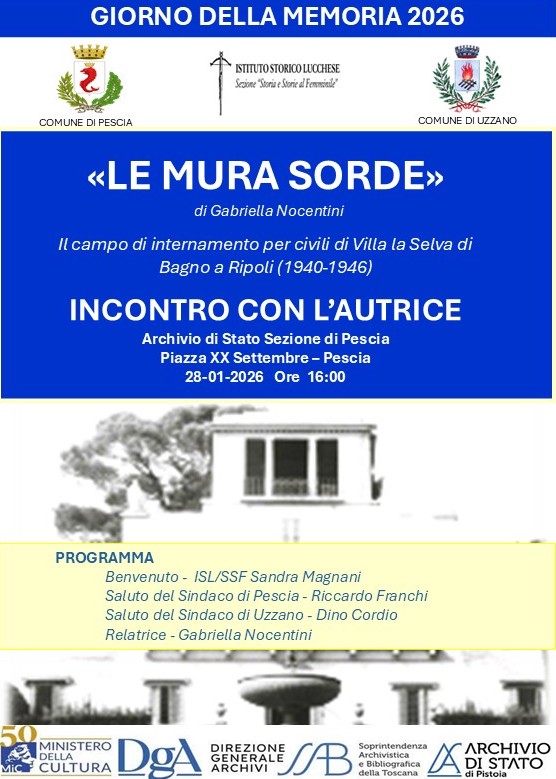 Quando si avvicina il Giorno della Memoria ovunque si moltiplicano le iniziative: compaiono pubblicazioni con nuove scoperte archivistiche, escono diari e testimonianze inedite, documentari e film (i bellissimi La zona di interesse e Lezioni di persiano, fra i tanti) trovano spazio sui canali televisivi, si realizzano sceneggiati che aggiungono particolari e situazioni poco note, come il recente Morbo K., andato in onda su Rai 1. In molte città si tengono cerimonie, manifestazioni, mostre, eventi e si pongono pietre di inciampo in ricordo delle vittime della Shoah. Il Giorno della Memoria fu introdotto in Italia con la legge n.211 del 20 luglio 2000 e fu celebrato dal 27 gennaio successivo; la data prescelta ricorda infatti il momento in cui l’Armata Rossa sovietica liberò il lager di Auschwitz. Nel 2005 la celebrazione fu adottata a livello internazionale, con una risoluzione dell’Assemblea generale dell’Onu. Anche a Pescia (Pistoia) la Giornata è stata degnamente ricordata: mercoledì 28 gennaio, alle ore 16, presso la bella sede dell’Archivio di Stato è avvenuta la presentazione del libro Le mura sorde di Gabriella Nocentini, edizioni Apice libri (2025).