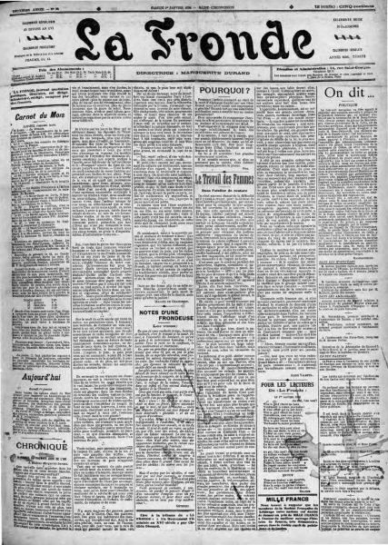 «Meditando sulla giustizia delle rivendicazioni delle donne, riconoscendone i meriti e considerando un dovere sociale aiutarle a trionfare diffondendole, ho concepito l’idea di un grande giornale femminista in cui, quotidianamente, le donne difendessero gli interessi delle donne». Questo è l’intento di Marguerite Durand, quando fonda il primo quotidiano diretto, amministrato e composto esclusivamente da donne, La Fronde. Il primo numero esce il 9 dicembre 1897, con lo scopo di continuare là dove si era interrotto La Citoyenne, giornale femminista francese pubblicato a Parigi dal 1881 al 1891 da Hubertine Auclert: La Citoyenne usciva ogni due mesi e sosteneva per le donne il diritto di votare e di candidarsi a cariche pubbliche. All’inizio La Fronde fu criticato e definito “Il tempo in sottoveste”, e fu pronosticata una sua veloce e inevitabile fine. Invece ebbe successo, il che non era affatto scontato e ancora esisteva cinque anni dopo, quando Marguerite Durand lasciò la direzione del giornale il 15 dicembre 1902.