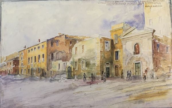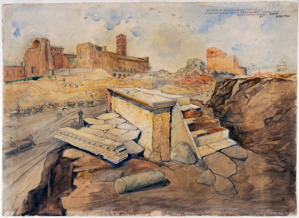 Maria Teresa Carolina Barosso fu testimone instancabile della più spettacolare stagione di scavi e scoperte nell’area archeologica, figura di rilievo, purtroppo poco conosciuta, nel panorama culturale italiano del primo Novecento. L’altissima qualità della sua opera le valse il riconoscimento a livello internazionale, ma non le assicurò la memoria, che fu offuscata dalle tante personalità accademiche e scientifiche che si avvalsero del suo lavoro. Era nata a Torino il 21 agosto del 1879; diplomatasi nel 1900 presso l’Accademia Albertina, dopo aver frequentato prima il corso serale di ornato e disegno con attestato di premio, poi il corso triennale, vinse una cattedra di disegno nelle scuole medie. Giunse a Roma nel 1905 per collaborare con Giacomo Boni, allora direttore degli scavi del Foro Romano, prima funzionaria femminile al Ministero della Pubblica istruzione, Soprintendenza alle Belle arti di Roma e del Lazio, e unica donna disegnatrice in quegli uffici. «Bizzarra nel vestire come nelle acconciature», così viene descritta, si innamorò della sua città di adozione, di cui sapeva cogliere particolari non consueti. Cominciò col Foro di Traiano a realizzare sin dal 1906 la documentazione grafica dell’area della Colonna e dei Mercati.