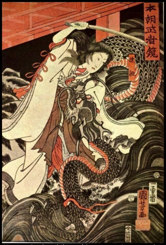 Continuai la ricerca, spinta da un’altra stampa antica, trovata ancora casualmente, di Utagawa Kuniyoshi: Tachibana-hime che usa la sua spada contro un dragone sotto il ponte (1855). Scoprii che quella stampa faceva riferimento a una leggenda. Mi piacque subito, soprattutto perché dimostrava che qualcuno in passato aveva creduto che una donna fosse così potente da poter affrontare dei pericoli da sola, alla pari di una figura maschile come San Giorgio. Cercai la vicenda a cui si riferiva, ma in proposito trovai solo un sito di dubbia veridicità, che non solo citava la leggenda stravolgendone il senso, ma non riportava nemmeno fonti certe. Pertanto, non potevo inserirla nella tesi.