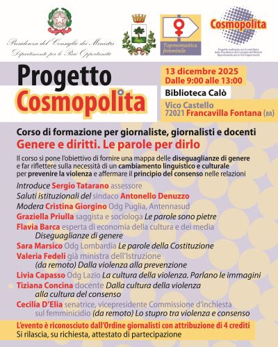 Il 13 e il 14 dicembre scorsi a Francavilla Fontana, per il terzo anno consecutivo, si è svolto il Festival dei Diritti, un appuntamento ormai divenuto occasione per lanciare alla città messaggi per una società sempre più aperta e accogliente. Gli appuntamenti diffusi in vari punti della città hanno visto la partecipazione di associazioni, scuole, librerie, Commissione Pari Opportunità e Consiglio comunale dei ragazzi e delle ragazze. Toponomastica femminile per questo festival ha organizzato tra l’altro un corso di formazione per giornalisti, giornaliste e docenti, il 13 dicembre alla Biblioteca Calò, dal titolo: Genere e diritti. Le parole per dirlo. Il corso si poneva l’obiettivo di fornire una mappa delle diseguaglianze di genere e far riflettere sulla necessità di un cambiamento linguistico e culturale per prevenire la violenza e affermare il principio del consenso nelle relazioni.