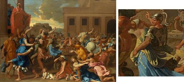 Nel dipinto di Pietro da Cortona c’è grande ottimismo, gli uomini pare che stanno facendo la mietitura del grano. Le donne sono sacrificate per fare grande Roma. Poussin rende il soggetto più drammatico, ma sul fondo si vede una coppia che si allontana: lui la prende per la vita in modo gentile, lei non si difende, ma accompagna il suo rapitore che indica il cielo con un dito, come a voler dire che questo rapimento è voluta dalle divinità.